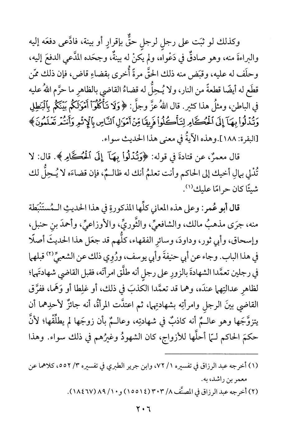 وكذلك لو ثبَت على رجلٍ لرجلٍ حقٌّ بإقرارٍ أو بينة، فادَّعى دفعَه إليه والبراءةَ منه، وهو صادقٌ في دَعْواه، ولم يكنْ له بينةٌ، وجحَده المدَّعي الدفعَ إليه، وحلَف له عليه، وقبَض منه ذلك الحقَّ مرةً أُخرى بقضاءِ قاض، فإن ذلك ممّن قطَع له أيضًا قطعةً من النار، ولا يُحِلُّ له قضاءُ القاضي بالظاهرِ ما حرَّم اللهُ عليه في الباطن، ومثلُ هذا كثير. قال اللهُ عزَّ وجلَّ: {وَلَا تَأْكُلُوا أَمْوَالَكُمْ بَيْنَكُمْ بِالْبَاطِلِ وَتُدْلُوا بِهَا إِلَى الْحُكَّامِ لِتَأْكُلُوا فَرِيقًا مِنْ أَمْوَالِ النَّاسِ بِالْإِثْمِ وَأَنْتُمْ تَعْلَمُونَ} [البقرة: ١٨٨]. وهذه الآيةُ في معنى هذا الحديث سواء.