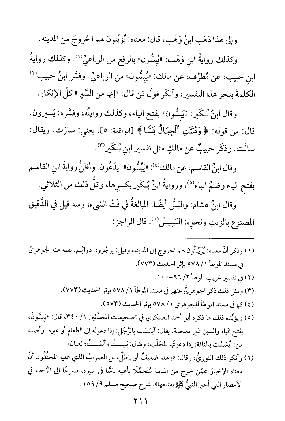 وكذلك روايةُ ابنِ وَهْب: "يُبِسُّون" بالرفع من الرباعيِّ (¬١). وكذلك روايةُ ابنِ حبيب، عن مُطرِّف، عن مالك: "يُبِسُّون" من الرباعيِّ. وفسَّر ابنُ حبيب (¬٢) الكلمةَ بنحو هذا التفسير، وأنكَر قولَ مَن قال: "إنها من السَّير" كلّ الإنكار.