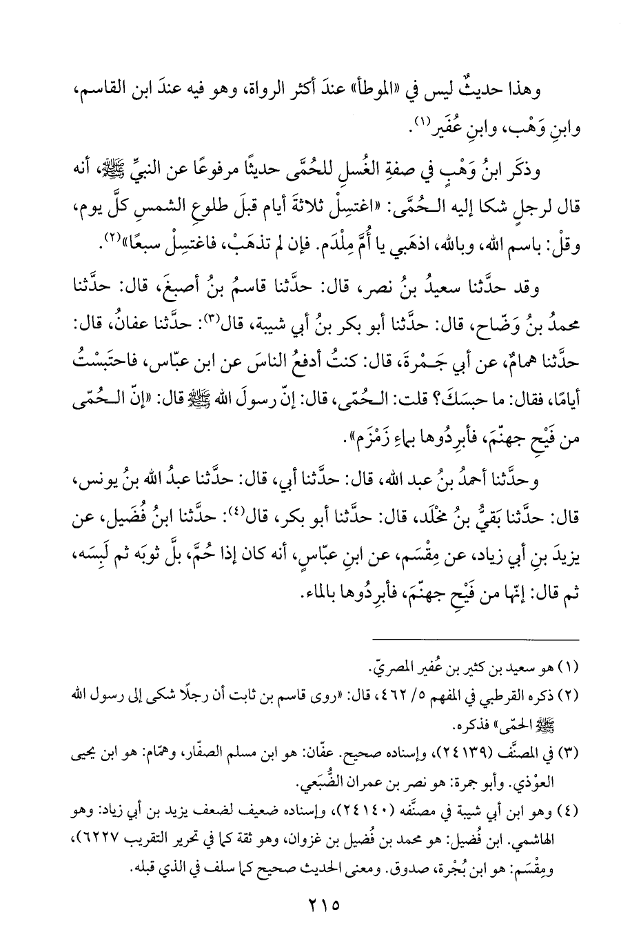 وقد حدَّثنا سعيدُ بنُ نصر، قال: حدَّثنا قاسمُ بنُ أصبغَ، قال: حدَّثنا محمدُ بنُ وَضّاح، قال: حدَّثنا أبو بكر بنُ أبي شيبة، قال (¬٣): حدَّثنا عفانُ، قال: حدَّثنا همامٌ، عن أبي جَمْرةَ، قال: كنتُ أدفعُ الناسَ عن ابن عبّاس، فاحتَبسْتُ أيامًا، فقال: ما حبسَكَ؟ قلت: الحُمّى، قال: إنّ رسولَ الله - صلى الله عليه وسلَّم - قال: "إنّ الحُمّى من فَيْحِ جهنّمَ، فأبرِدُوها بماءِ زَمْزَم".