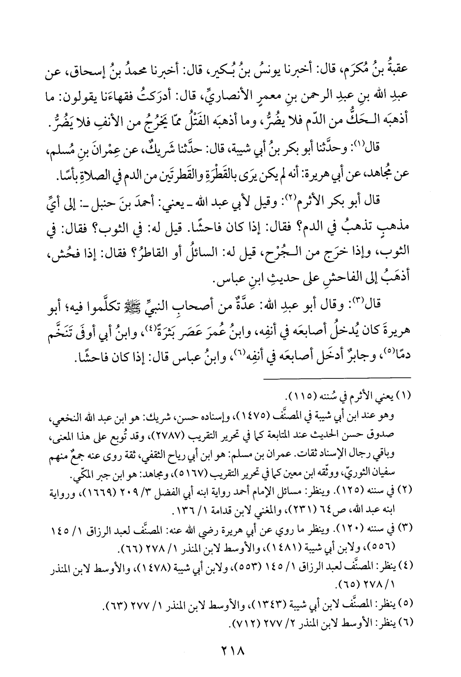عقبةُ بنُ مُكرَم، قال: أخبرنا يونسُ بنُ بُكير، قال: أخبرنا محمدُ بنُ إسحاق، عن عبدِ الله بنِ عبدِ الرحمن بنِ معمرٍ الأنصاريِّ، قال: أدرَكتُ فقهاءَنا يقولون: ما أذهبَه الحَكُّ من الدّم فلا يضُرُّ، وما أذهبَه الفَتْلُ ممّا يَخرُجُ من الأنفِ فلا يَضُرُّ.