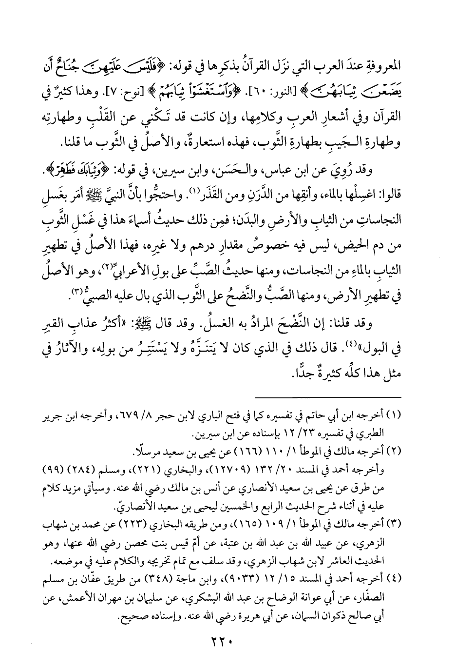 وقد رُوِيَ عن ابن عباس، والحَسَن، وابن سيرين، في قوله: {وَثِيَابَكَ فَطَهِّرْ}. قالوا: اغسِلْها بالماء، وأنقِها من الدَّرَنِ ومن القَذَر (¬١). واحتجُّوا بأنَّ النبيَّ - صلى الله عليه وسلم - أمَر بغَسلِ النجاساتِ من الثيابِ والأرضِ والبدَن؛ فمِن ذلك حديثُ أسماءَ هذا في غَسْلِ الثَّوبِ من دم الحيض، ليس فيه خصوصُ مقدارِ درهم ولا غيرِه، فهذا الأصلُ في تطهيرِ الثيابِ بالماءِ من النجاسات، ومنها حديثُ الصَّبِّ على بولِ الأعرابيِّ (¬٢)، وهو الأصلُ في تطهيرِ الأرض، ومنها الصَّبُّ والنَّضحُ على الثَّوب الذي بال عليه الصبيُّ (¬٣).