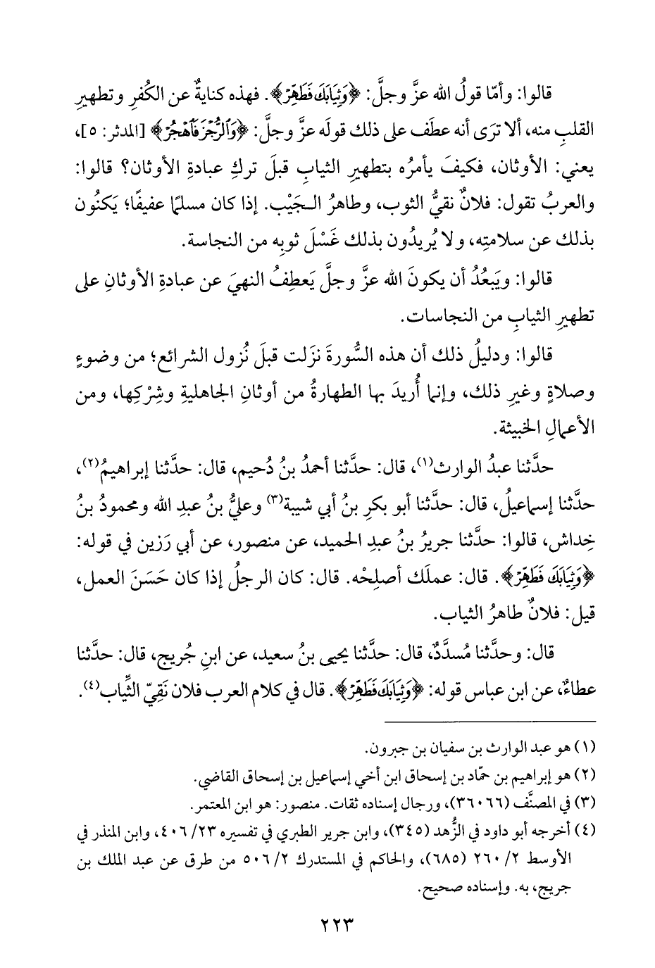 حدَّثنا عبدُ الوارث (¬١)، قال: حدَّثنا أحمدُ بنُ دُحيم، قال: حدَّثنا إبراهيمُ (¬٢)، حدَّثنا إسماعيلُ، قال: حدَّثنا أبو بكرِ بنُ أبي شيبة (¬٣) وعليُّ بنُ عبدِ الله ومحمودُ بنُ خِداش، قالوا: حدَّثنا جريرُ بنُ عبدِ الحميد، عن منصور، عن أبي رَزين في قوله: {وَثِيَابَكَ فَطَهِّرْ}. قال: عملَك أصلِحْه. قال: كان الرجلُ إذا كان حَسَنَ العمل، قيل: فلانٌ طاهرُ الثياب.
