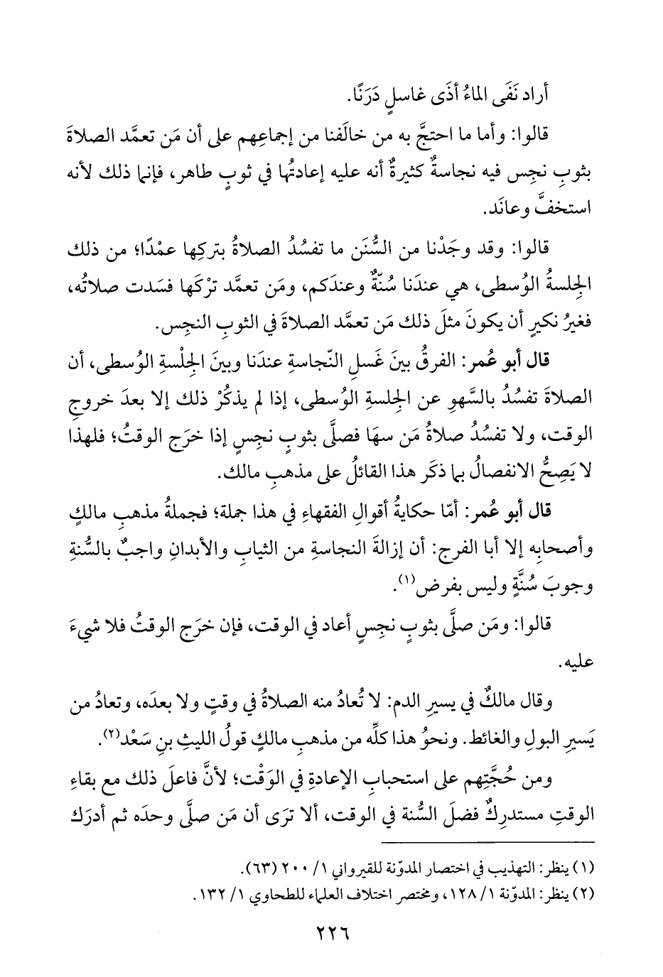 قالوا: وقد وجَدْنا من السُّنَن ما تفسُدُ الصلاةُ بتركِها عمْدًا؛ من ذلك الجِلسةُ الوُسطى، هي عندَنا سُنّةٌ وعندَكم، ومَن تعمَّد ترْكَها فسَدت صلاتُه، فغيرُ نكيرٍ أن يكونَ مثلَ ذلك مَن تعمَّد الصلاةَ في الثوبِ النجِس.