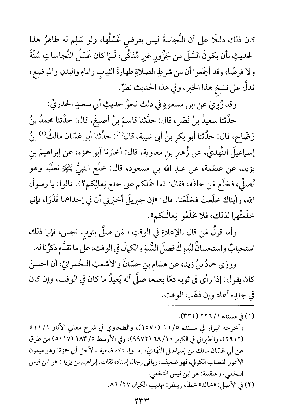 حدَّثنا سعيدُ بنُ نَصْر، قال: حدَّثنا قاسمُ بنُ أصبغَ، قال: حدَّثنا محمدُ بنُ وَضّاح، قال: حدَّثنا أبو بكرِ بنُ أبي شيبة، قال (¬١): حدَّثنا أبو غسّان مالكُ (¬٢) بنُ إسماعيلَ النَّهديُّ، عن زُهيرِ بنِ معاوية، قال: أخبَرنا أبو حمزة، عن إبراهيمَ بنِ يزيد، عن علقمة، عن عبدِ الله بنِ مسعود، قال: خلَع النبيُّ - صلى الله عليه وسلم - نعلَيْه وهو يُصلِّي، فخلَع مَن خلفَه، فقال: "ما حمَلكم على خَلع نِعالِكم؟ ". قالوا: يا رسولَ الله، رأيناك خلَعتَ فخلَعْنا. قال: "إن جبريلَ أخبَرني أن في إحداهما قَذَرًا، فإنما خلَعتُهما لذلك، فلا تخلَعُوا نِعالَكم".