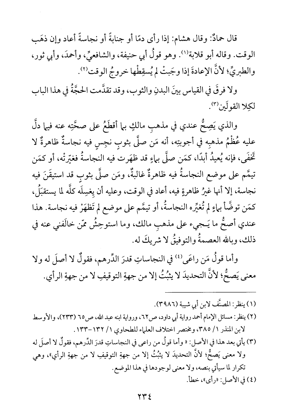 (¬٣) يأتي بعد هذا في الأصل: "وأما قولُ من راعى في النجاساتِ قدرَ الدِّرهم، فقولٌ لا أصلَ له ولا معنى يَصحُّ؛ لأنَّ التحديدَ لا يثبُتُ إلا من جهةِ التوقيفِ لا من جهةِ الرأي"، وهي تكرار لما سيأتي بنصه، ولا معنى لوجودها في هذا الموضع.