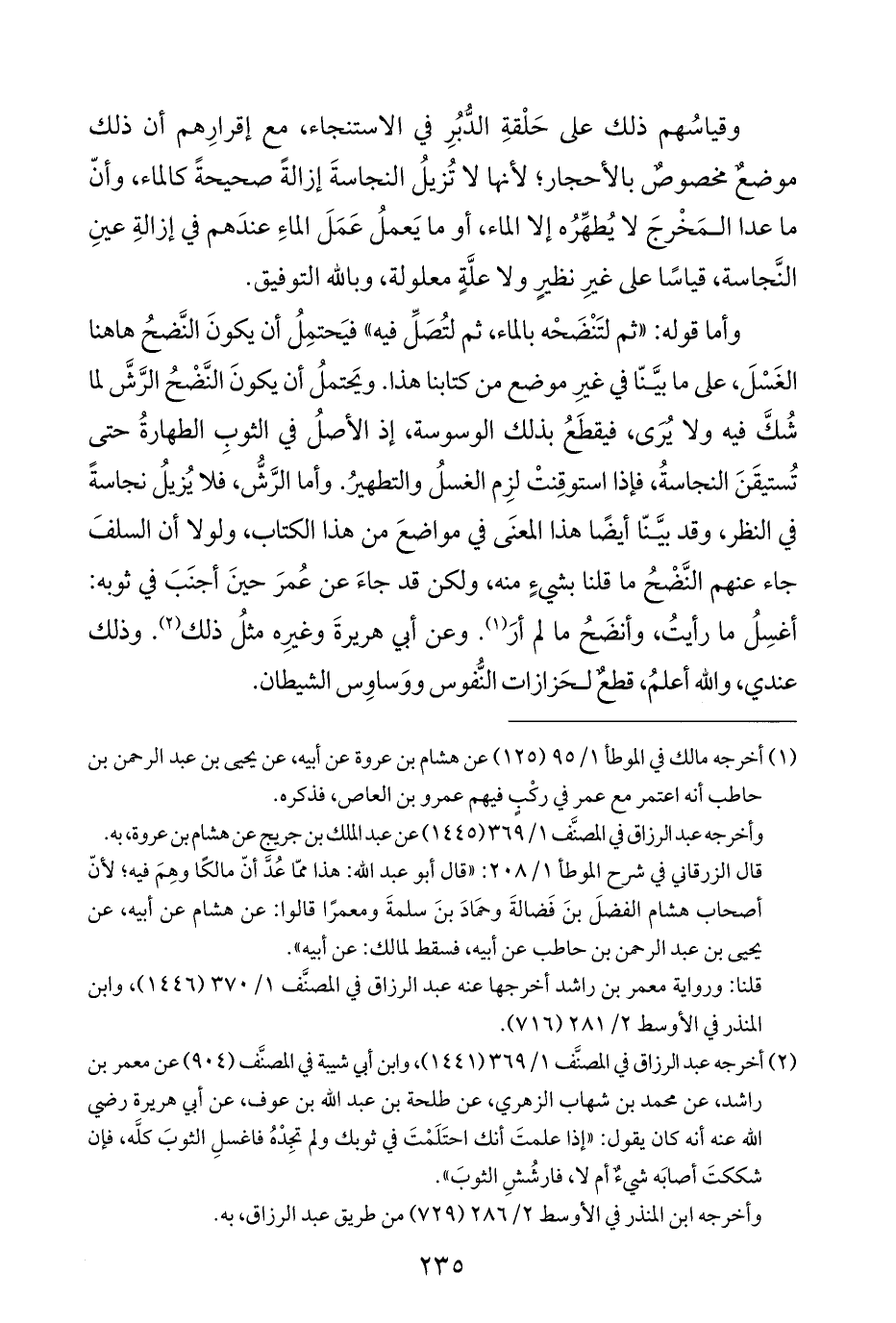 (¬٢) أخرجه عبد الرزاق في المصنَّف ١/ ٣٦٩ (١٤٤١)، وابن أبي شيبة في المصنَّف (٩٠٤) عن معمر بن راشد، عن محمد بن شهاب الزهري، عن طلحة بن عبد الله بن عوف، عن أبي هريرة رضي الله عنه أنه كان يقول: "إذا علمتَ أنك احتَلَمْتَ في ثوبك ولم تجِدْهُ فاغسلِ الثوبَ كلَّه، فإن شككتَ أصابَه شيءٌ أم لا، فارشُشِ الثوبَ".