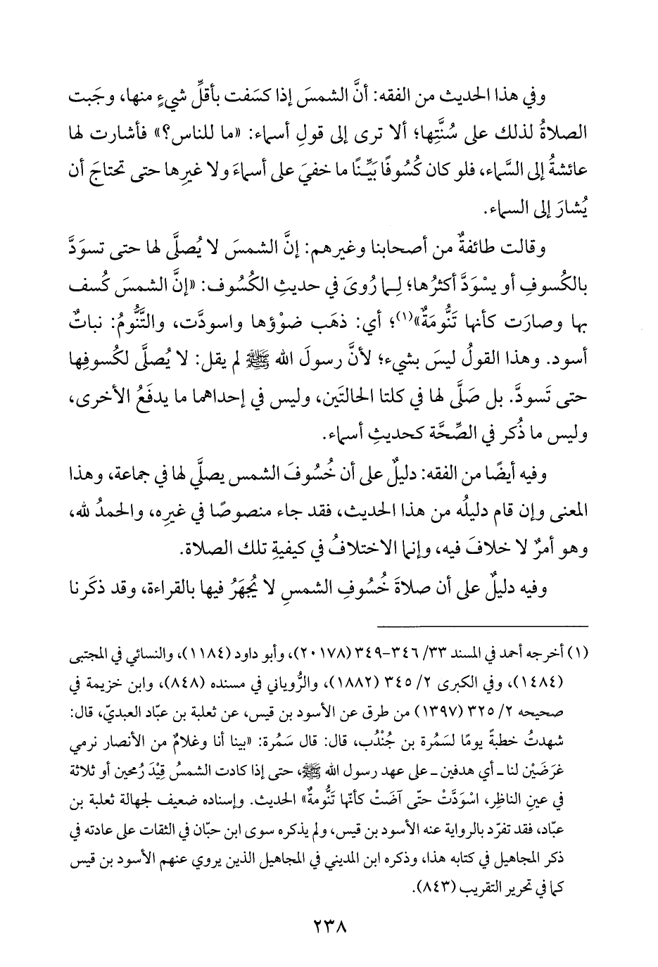 وقالت طائفةٌ من أصحابنا وغيرهم: إنَّ الشمسَ لا يُصلَّى لها حتى تسوَدَّ بالكُسوفِ أو يسْوَدَّ أكثرُها؛ لِما رُوىَ في حديثِ الكُسُوف: "إنَّ الشمسَ كُسف بها وصارَت كأنها تَنُّومَةٌ" (¬١)؛ أي: ذهَب ضوْؤها واسودَّت، والتَّنُّومُ: نباتٌ أسود. وهذا القولُ ليسَ بشيء؛ لأنَّ رسولَ الله - صلى الله عليه وسلم - لم يقل: لا يُصلَّى لكُسوفِها حتى تَسودَّ. بل صَلَّى لها في كلتا الحالتَين، وليس في إحداهما ما يدفَعُ الأخرى، وليس ما ذُكر في الصِّحَّة كحديثِ أسماء.