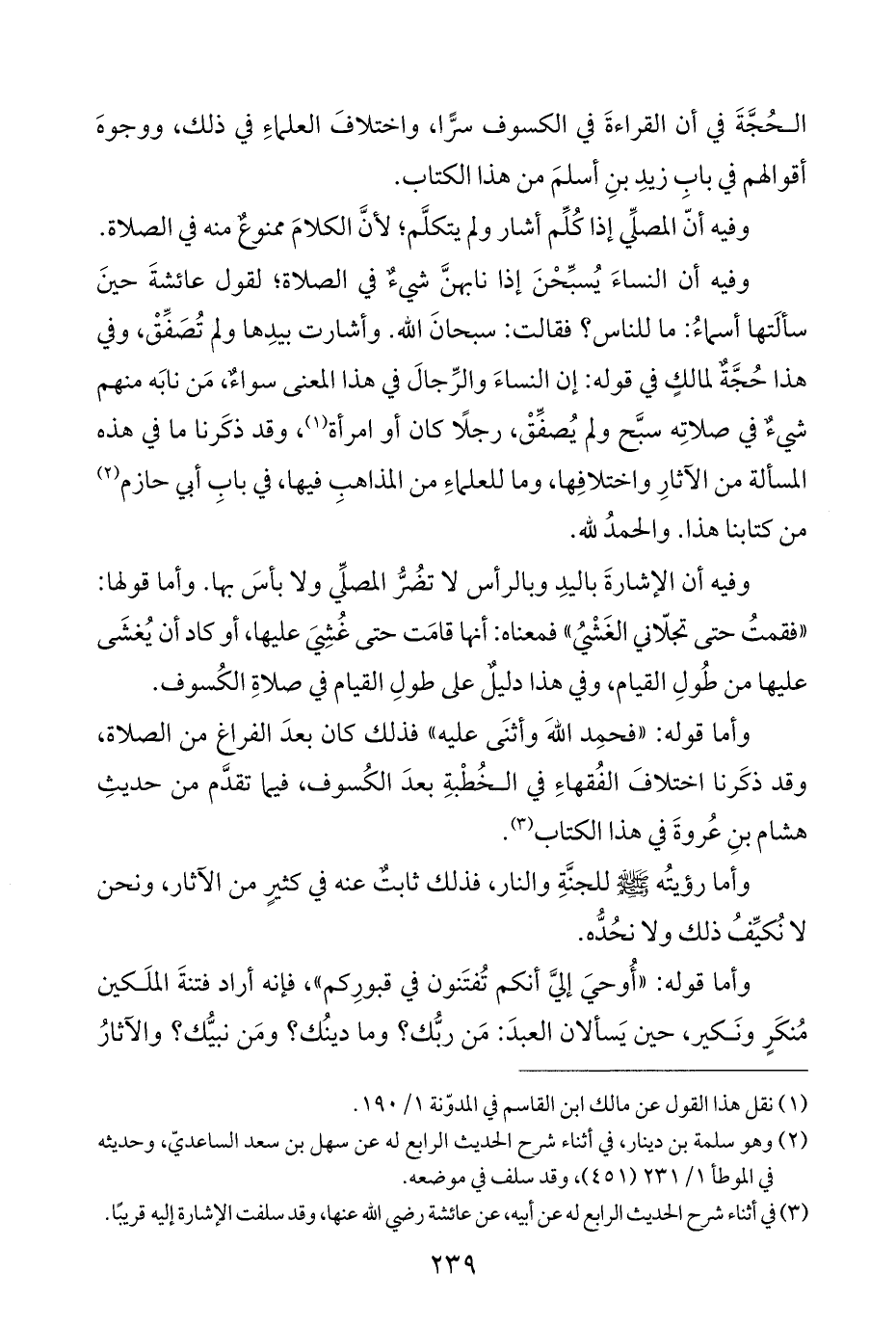 وفيه أن النساءَ يُسبِّحْنَ إذا نابهنَّ شيءٌ في الصلاة؛ لقول عائشةَ حينَ سألَتها أسماءُ: ما للناس؟ فقالت: سبحانَ الله. وأشارت بيدِها ولم تُصَفِّقْ، وفي هذا حُجَّةٌ لمالكٍ في قوله: إن النساءَ والرِّجالَ في هذا المعنى سواءٌ، مَن نابَه منهم شيءٌ في صلاتِه سبَّح ولم يُصفِّقْ، رجلًا كان أو امرأة (¬١)، وقد ذكَرنا ما في هذه المسألة من الآثارِ واختلافِها، وما للعلماءِ من المذاهبِ فيها، في بابِ أبي حازم (¬٢) من كتابنا هذا. والحمدُ لله.