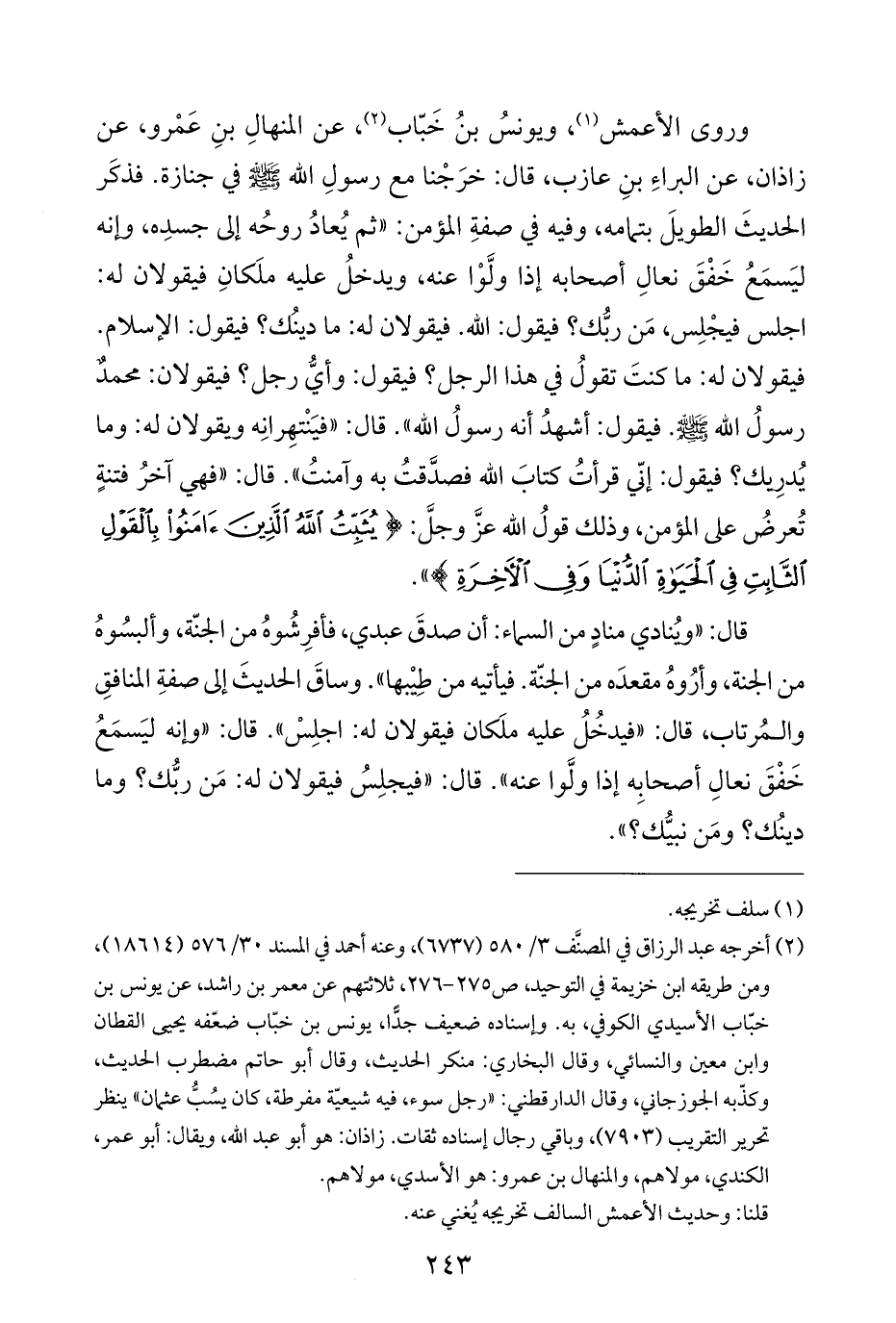 وروى الأعمش (¬١)، ويونسُ بنُ خَبّاب (¬٢)، عن المنهالِ بنِ عَمْرو، عن زاذان، عن البراءِ بنِ عازب، قال: خرَجْنا مع رسولِ الله - صلى الله عليه وسلم - في جنازة. فذكَر الحديثَ الطويلَ بتمامه، وفيه في صفةِ المؤمن: "ثم يُعادُ روحُه إلى جسدِه، وإنه ليَسمَعُ خَفْقَ نعالِ أصحابه إذا ولَّوْا عنه، ويدخلُ عليه ملَكانِ فيقولان له: اجلس فيجْلِس، مَن ربُّك؟ فيقول: الله. فيقولان له: ما دينُك؟ فيقول: الإسلام. فيقولان له: ما كنتَ تقولُ في هذا الرجل؟ فيقول: وأيُّ رجل؟ فيقولان: محمدٌ رسولُ الله - صلى الله عليه وسلم -. فيقول: أشهدُ أنه رسولُ الله". قال: "فيَنْتهِرانِه ويقولان له: وما يُدرِيك؟ فيقول: إنِّي قرأتُ كتابَ الله فصدَّقتُ به وآمنتُ". قال: "فهي آخرُ فتنةٍ تُعرضُ على المؤمن، وذلك قولُ الله عزَّ وجلَّ: {يُثَبِّتُ اللَّهُ الَّذِينَ آمَنُوا بِالْقَوْلِ الثَّابِتِ فِي الْحَيَاةِ الدُّنْيَا وَفِي الْآخِرَةِ} ".