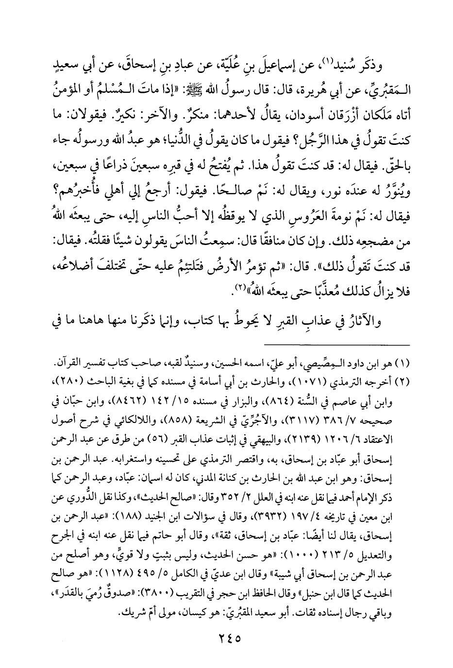وذكَر سُنيد (¬١)، عن إسماعيلَ بنِ عُلَيّة، عن عبادِ بنِ إسحاقَ، عن أبي سعيدٍ المَقبُريِّ، عن أبي هُريرة، قال: قال رسولُ الله - صلى الله عليه وسلم -: "إذا ماتَ المُسْلمُ أو المؤمنُ أتاه مَلكان أزْرَقان أسودان، يقالُ لأحدهما: منكرٌ. والآخر: نكيرٌ. فيقولان: ما كنتَ تقولُ في هذا الرَّجُل؟ فيقول ما كان يقولُ في الدُّنيا؛ هو عبدُ الله ورسولُه جاء بالحقّ. فيقال له: قد كنتَ تقولُ هذا. ثم يُفتحُ له في قبرِه سبعينَ ذراعًا في سبعين، ويُنوَّرُ له عندَه نور، ويقال له: نَمْ صالحًا. فيقول: أرجعُ إلي أهلي فأُخبرُهم؟ فيقال له: نَمْ نومةَ العَرُوسِ الذي لا يوقظُه إلا أحبُّ الناسِ إليه، حتى يبعثَه اللهُ من مضجعِه ذلك. وإن كان منافقًا قال: سمِعتُ الناسَ يقولون شيئًا فقلتُه. فيقال: قد كنتَ تَقولُ ذلك". قال: "ثم تؤمرُ الأرضُ فتَلتئِمُ عليه حتَّى تختلفَ أضلاعُه، فلا يزالُ كذلك مُعذَّبًا حتى يبعثَه اللهُ" (¬٢).