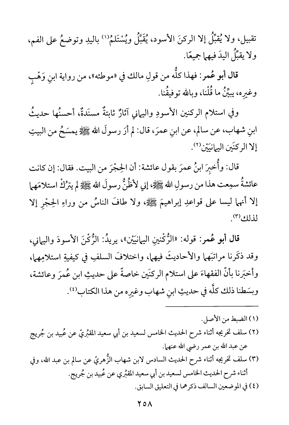وفي استلام الركنين الأسودِ واليماني آثارٌ ثابتةٌ مسنَدةٌ، أحسنُها حديثُ ابنِ شهاب، عن سالم، عن ابنِ عمرَ، قال: لم أرَ رسولَ الله - صلى الله عليه وسلم - يمسَحُ من البيتِ إلا الركنَين اليمانيَيْن (¬٢).