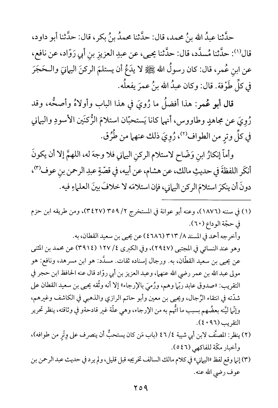 حدَّثنا عبدُ الله بنُ محمد، قال: حدَّثنا محمدُ بنُ بكر، قال: حدَّثنا أبو داود، قال (¬١): حدَّثنا مُسدَّد، قال: حدَّثنا يحيى، عن عبدِ العزيزِ بنِ أبي رَوّاد، عن نافع، عن ابنِ عُمر، قال: كان رسولُ الله - صلى الله عليه وسلم - لا يدَعُ أن يستلمَ الركنَ اليمانيَ والحَجَرَ في كلِّ طَوْفة. قال: وكان عبدُ الله بنُ عمرَ يفعلُه.