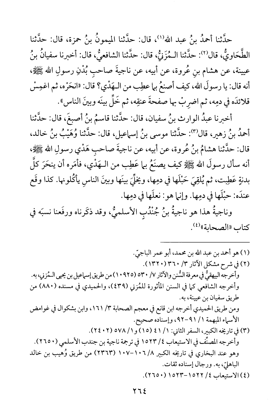 حدَّثنا أحمدُ بنُ عبد الله (¬١)، قال: حدَّثنا الميمونُ بنُ حمزة، قال: حدَّثنا الطَّحَاويُّ، قال (¬٢): حدَّثنا المُزَنيُّ، قال: حدَّثنا الشافعيُّ، قال: أخبرنا سفيانُ بنُ عيينة، عن هشام بنِ عُروة، عن أبيه، عن ناجيةَ صاحبِ بُدْنِ رسولِ الله - صلى الله عليه وسلم -، أنه قال: يا رسولَ الله، كيف أصنعُ بما عطِب من الهَدْي؟ قال: "انحَرْه، ثم اغمِسْ قلائدَه في دمِه، ثم اضرِبْ بها صفحةَ عنقِه، ثم خَلِّ بينَه وبينَ الناس".