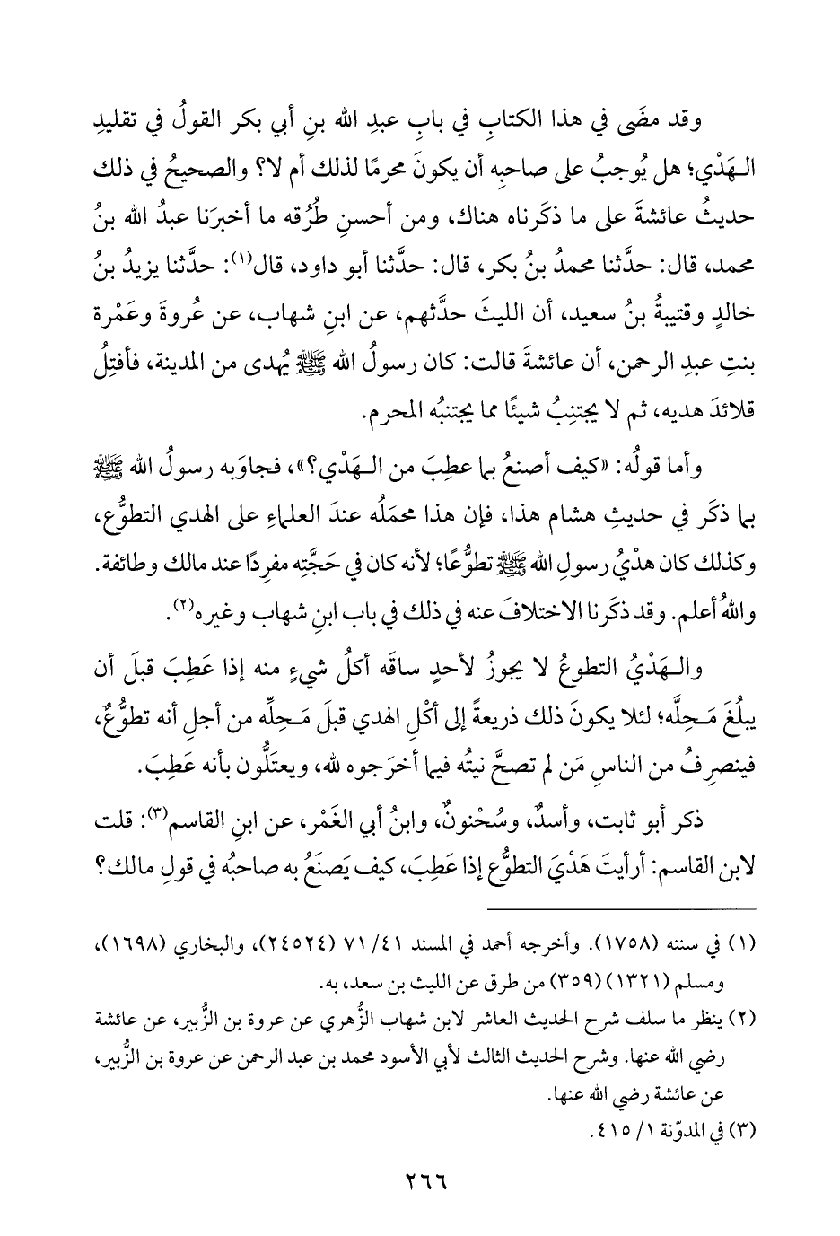 وقد مضَى في هذا الكتابِ في بابِ عبدِ الله بنِ أبي بكر القولُ في تقليدِ الهَدْي؛ هل يُوجبُ على صاحبِه أن يكونَ محرمًا لذلك أم لا؟ والصحيحُ في ذلك حديثُ عائشةَ على ما ذكَرناه هناك، ومن أحسنِ طُرُقه ما أخبرَنا عبدُ الله بنُ محمد، قال: حدَّثنا محمدُ بنُ بكر، قال: حدَّثنا أبو داود، قال (¬١): حدَّثنا يزيدُ بنُ خالدٍ وقتيبةُ بنُ سعيد، أن الليثَ حدَّثهم، عن ابنِ شهاب، عن عُروةَ وعَمْرة بنتِ عبدِ الرحمن، أن عائشةَ قالت: كان رسولُ الله - صلى الله عليه وسلم - يُهدى من المدينة، فأفتِلُ قلائدَ هديه، ثم لا يجتنِبُ شيئًا مما يجتنبُه المحرم.