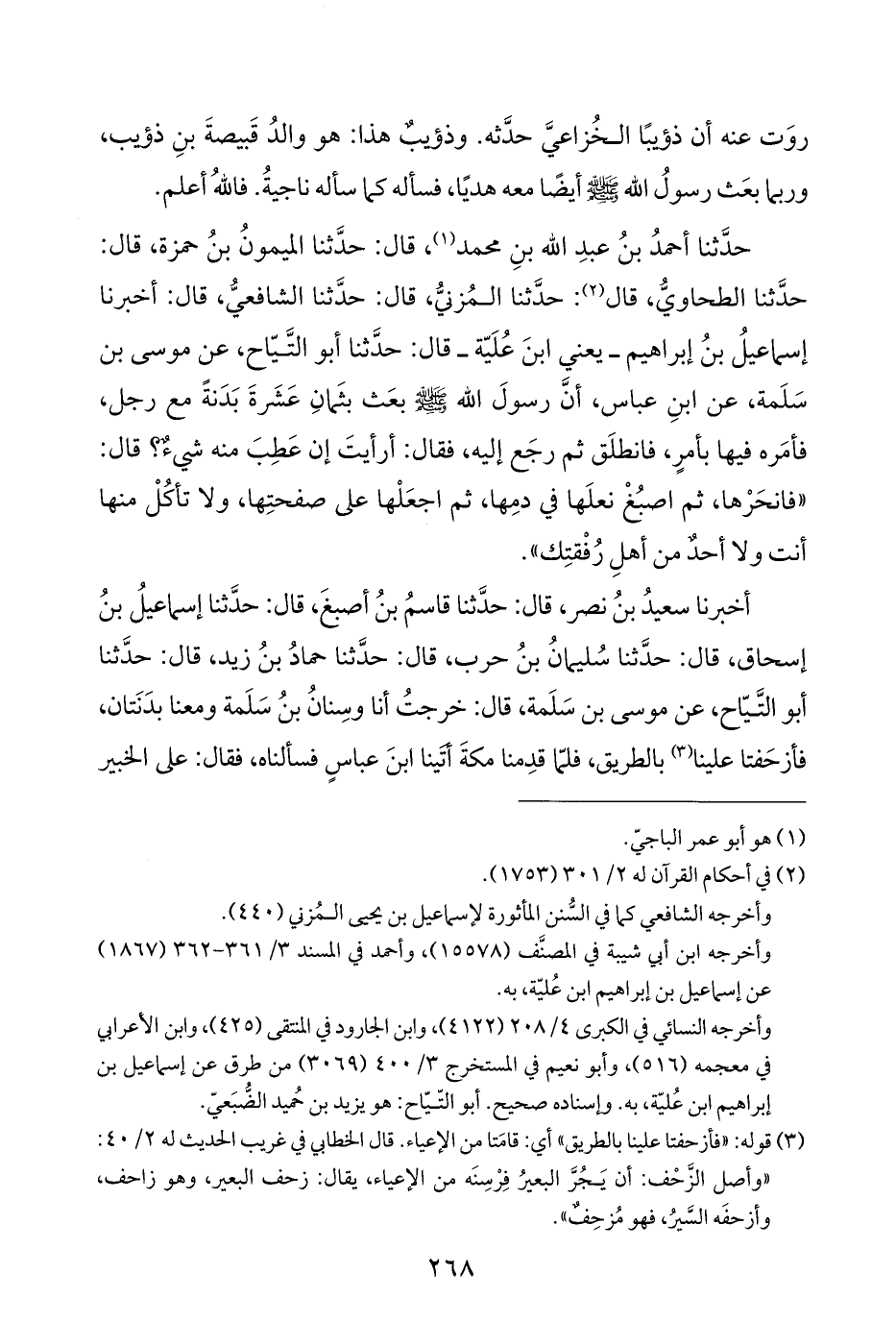 حدَّثنا أحمدُ بنُ عبدِ الله بنِ محمد (¬١)، قال: حدَّثنا الميمونُ بنُ حمزة، قال: حدَّثنا الطحاويُّ، قال (¬٢): حدَّثنا المُزنيُّ، قال: حدَّثنا الشافعيُّ، قال: أخبرنا إسماعيلُ بنُ إبراهيم - يعني ابنَ عُلَيّة - قال: حدَّثنا أبو التَّيّاح، عن موسى بن سَلَمة، عن ابنِ عباس، أنَّ رسولَ الله - صلى الله عليه وسلم - بعَث بثَمانِ عَشَرةَ بَدَنةً مع رجل، فأمَره فيها بأمرٍ، فانطلَق ثم رجَع إليه، فقال: أرأيتَ إن عَطِبَ منه شيءٌ؟ قال: "فانحَرْها، ثم اصبُغْ نعلَها في دمِها، ثم اجعَلْها على صفحتِها، ولا تأكُلْ منها أنت ولا أحدٌ من أهلِ رُفْقتِك".