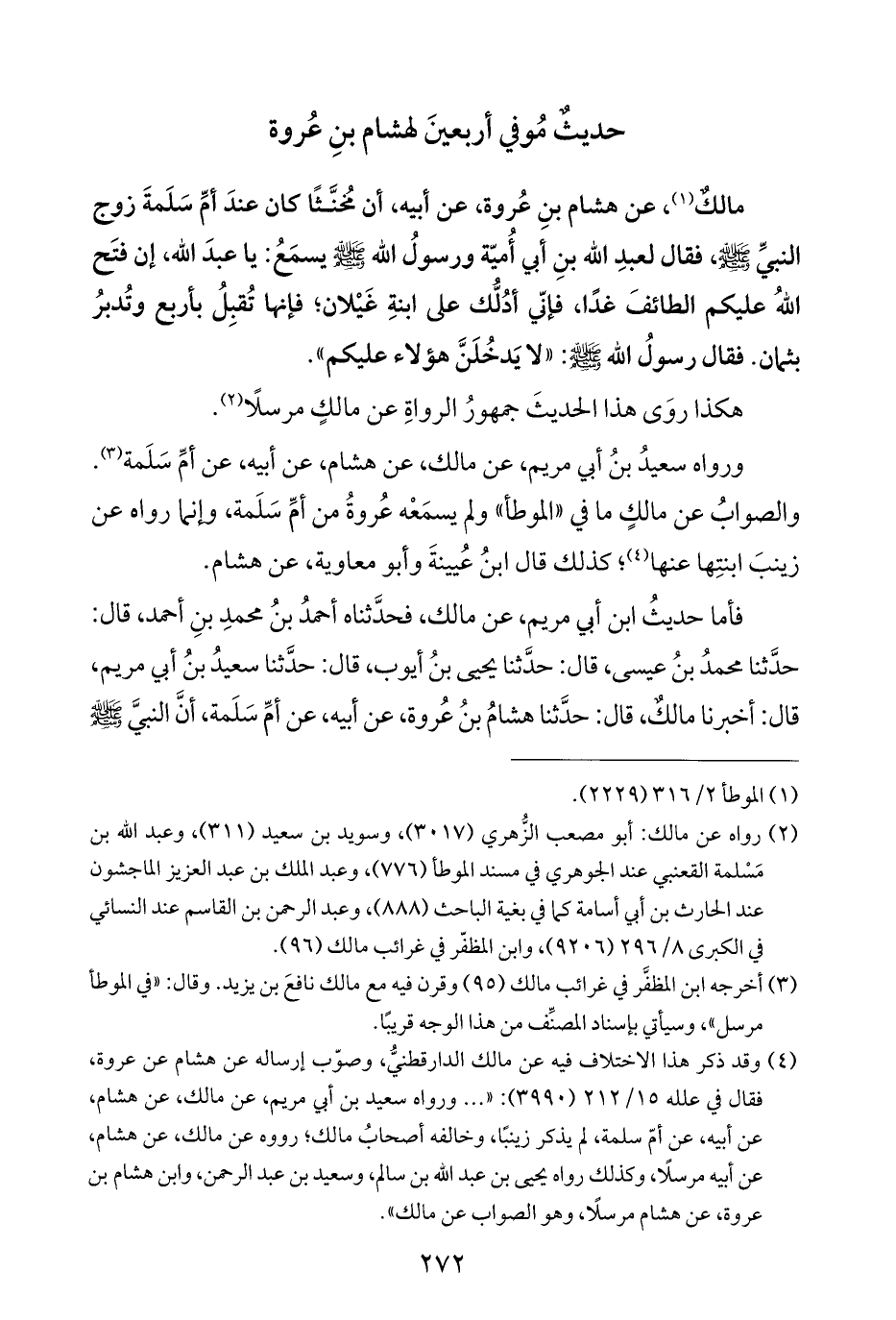 (¬٤) وقد ذكر هذا الاختلاف فيه عن مالك الدارقطنيُّ، وصوّب إرساله عن هشام عن عروة، فقال في علله ١٥/ ٢١٢ (٣٩٩٠): " ... ورواه سعيد بن أبي مريم، عن مالك، عن هشام، عن أبيه، عن أمّ سلمة، لم يذكر زينبًا، وخالفه أصحابُ مالك؛ رووه عن مالك، عن هشام، عن أبيه مرسلًا، وكذلك رواه يحيى بن عبد الله بن سالم، وسعيد بن عبد الرحمن، وابن هشام بن عروة، عن هشام مرسلًا، وهو الصواب عن مالك".