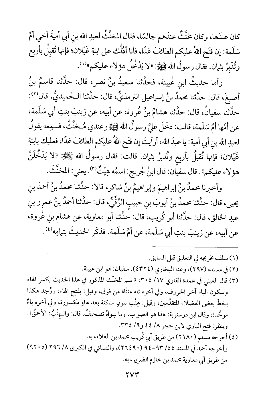 وأما حديثُ ابنِ عُيينة، فحدَّثنا سعيدُ بنُ نصر، قال: حدَّثنا قاسمُ بنُ أصبغَ، قال: حدَّثنا محمدُ بنُ إسماعيل الترمذيُّ، قال: حدَّثنا الحُميديُّ، قال (¬٢): حدَّثنا سفيانُ، قال: حدَّثنا هشامُ بنُ عُروة، عن أبيه، عن زينبَ بنتِ أبي سَلَمة، عن أمِّها أمِّ سَلَمة، قالت: دخَلَ عليَّ رسولُ الله - صلى الله عليه وسلم - وعندي مُخنَّثٌ، فسمِعه يقولُ لعبدِ الله بنِ أبي أمية: يا عبدَ الله، أرأيتَ إن فتَح اللهُ عليكم الطائفَ غدًا، فعليك بابنةِ غَيْلان؛ فإنها تُقبلُ بأربعٍ وتُدبرُ بثمان. قالت: فقال رسولُ الله - صلى الله عليه وسلم -: "لا يَدْخُلَنَّ هؤلاء عليكم". قال سفيان: قال ابنُ جُريج: اسمُه هِيْتٌ (¬٣). يعني: المخنَّثَ.