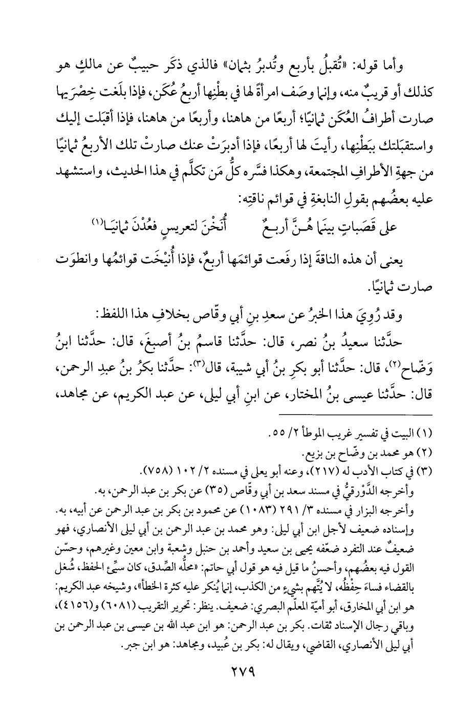 وأما قوله: "تُقبلُ بأربع وتُدبرُ بثمان" فالذي ذكَر حبيبٌ عن مالكٍ هو كذلك أو قريبٌ منه، وإنما وصَف امرأةً لها في بطْنِها أربعُ عُكَن، فإذا بلَغت خِصْرَيها صارت أطرافُ العُكَن ثمانيًا؛ أربعًا من هاهنا، وأربعًا من هاهنا، فإذا أقبَلت إليك واستقبَلتك ببَطْنِها، رأيتَ لها أربعًا، فإذا أدبرَتْ عنك صارتْ تلك الأربعُ ثمانيًا من جهةِ الأطرافِ المجتمعة، وهكذا فسَّره كلُّ مَن تكلَّم في هذا الحديث، واستشهد عليه بعضُهم بقولِ النابغةِ في قوائم ناقتِه: