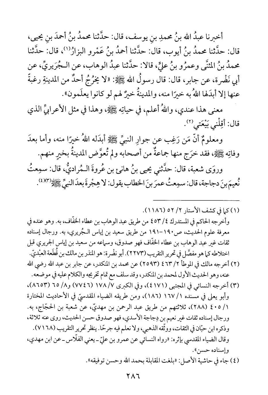 أخبرنا عبدُ الله بنُ محمدِ بنِ يوسف، قال: حدَّثنا محمدُ بنُ أحمدَ بنِ يحيى، قال: حدَّثنا محمدُ بنُ أيوب، قال: حدَّثنا أحمدُ بنُ عَمْرو البزارُ (¬١)، قال: حدَّثنا محمدُ بنُ المثنَّى وعمرُو بنُ عليٍّ، قالا: حدَّثنا عبدُ الوهاب، عن الجُرَيريِّ، عن أبي نَضْرة، عن جابر، قال: قال رسولُ الله - صلى الله عليه وسلم -: "لا يخرُجُ أحدٌ من المدينةِ رغبةً عنها إلا أبدَلها اللهُ به خيرًا منه، والمدينةُ خيرٌ لهم لو كانوا يعلَمون".