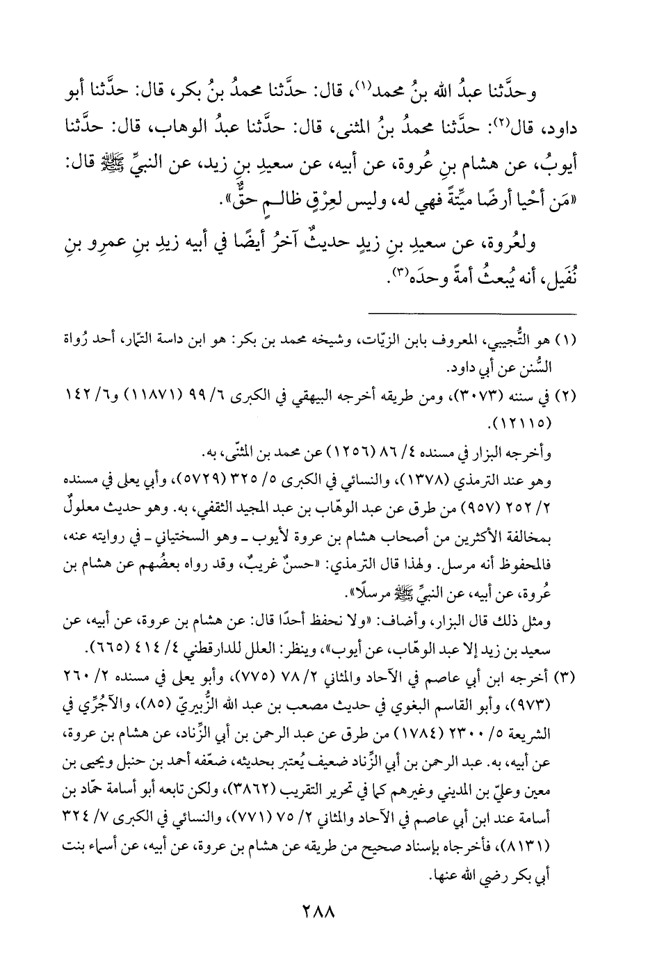 وحدَّثنا عبدُ الله بنُ محمد (¬١)، قال: حدَّثنا محمدُ بنُ بكر، قال: حدَّثنا أبو داود، قال (¬٢): حدَّثنا محمدُ بنُ المثنى، قال: حدَّثنا عبدُ الوهاب، قال: حدَّثنا أيوبُ، عن هشام بنِ عُروة، عن أبيه، عن سعيدِ بن زيد، عن النبيِّ - صلى الله عليه وسلم - قال: "مَن أحْيا أرضًا ميِّتةً فهي له، وليس لعِرْقٍ ظالمٍ حقٌّ".