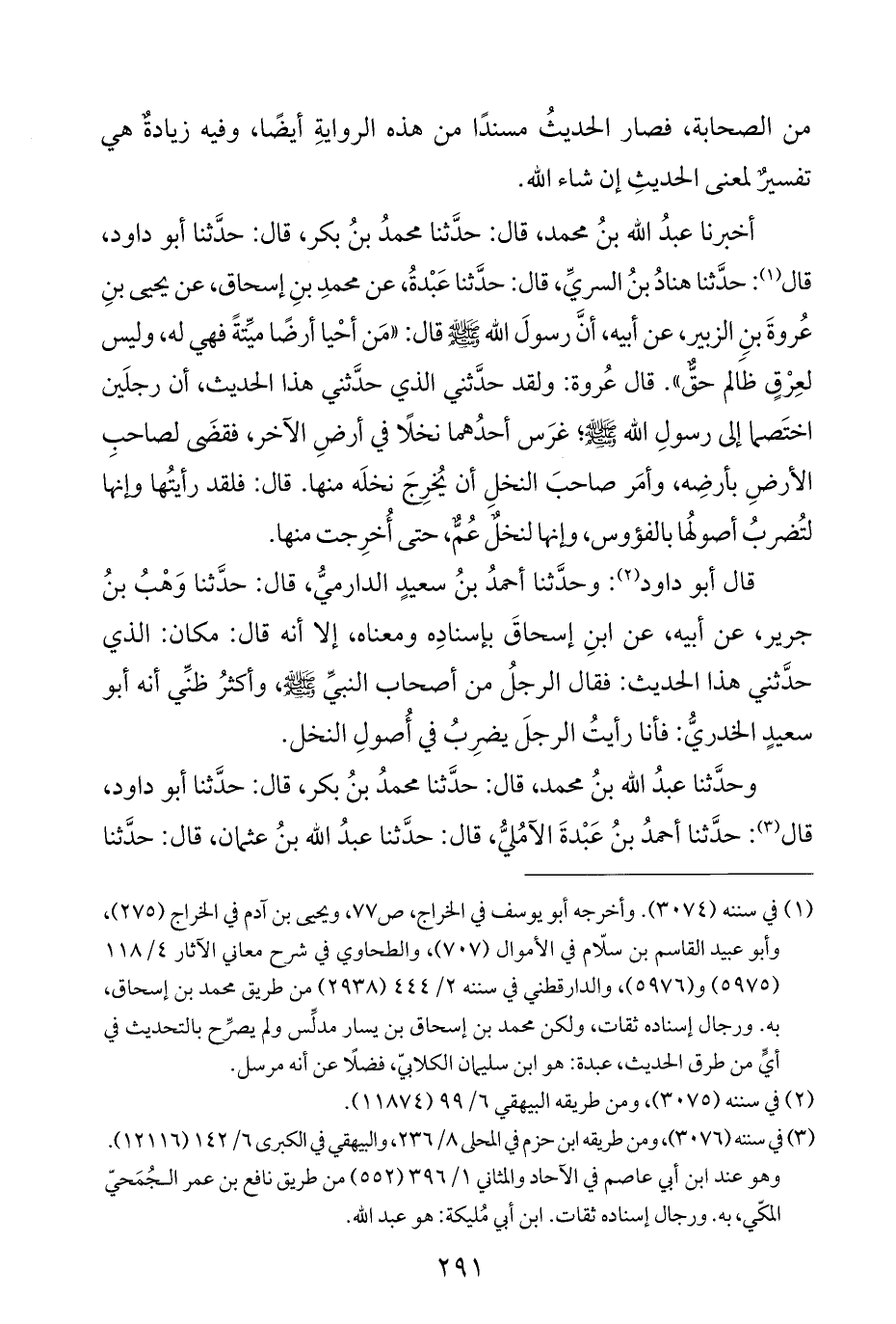 أخبرنا عبدُ الله بنُ محمد، قال: حدَّثنا محمدُ بنُ بكر، قال: حدَّثنا أبو داود، قال (¬١): حدَّثنا هنادُ بنُ السريِّ، قال: حدَّثنا عَبْدةُ، عن محمدِ بنِ إسحاق، عن يحيى بنِ عُروةَ بنِ الزبير، عن أبيه، أنَّ رسولَ الله - صلى الله عليه وسلم - قال: "مَن أحْيا أرضًا ميِّتةً فهي له، وليس لعِرْقٍ ظَالم حقٌّ". قال عُروة: ولقد حدَّثني الذي حدَّثني هذا الحديث، أن رجلَين اختَصما إلى رسولِ الله - صلى الله عليه وسلم -؛ غرَس أحدُهما نخلًا في أرضِ الآخر، فقضَى لصاحبِ الأرضِ بأرضِه، وأمَر صاحبَ النخل أن يُخرِجَ نخلَه منها. قال: فلقد رأيتُها وإنها لتُضربُ أصولهُا بالفؤوس، وإنها لنخلٌ عُمٌّ، حتى أُخرِجت منها.