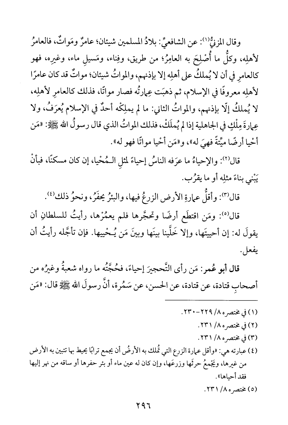 (¬٤) عبارته هي: "وأقل عمارة الزرع التي تمُلك به الأرضُ أن يجمع ترابًا يحيط بها تتبين به الأرض من غيرها، ويَجْمعُ حرثَها وزرعَها، وإن كان له عين ماء أو بئر حفرها أو ساقه من فهر إليها فقد أحياها".