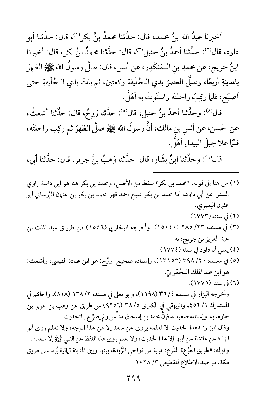 أخبرنا عبدُ الله بنُ محمد، قال: حدَّثنا محمدُ بنُ بكر (¬١)، قال: حدَّثنا أبو داود، قال (¬٢): حدَّثنا أحمدُ بنُ حنبل (¬٣)، قال: حدَّثنا محمدُ بنُ بكر، قال: أخبرنا ابنُ جريج، عن محمدِ بنِ المُنكَدِر، عن أنس، قال: صلَّى رسولُ الله - صلى الله عليه وسلم - الظهرَ بالمدينةِ أربعًا، وصلَّى العصرَ بذي الحُلَيفة ركعتين، ثم باتَ بذي الحُلَيفةِ حتى أصبَح، فلما ركِبَ راحلتَه واستَوتْ به أهَلَّ.