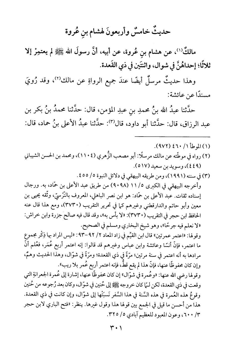 مالكٌ (¬١)، عن هشام بنِ عُروة، عن أبيه، أنَّ رسولَ الله - صلى الله عليه وسلم - لم يعتمِرْ إلا ثلاثًا؛ إحداهُنَّ في شوال، واثنتَين في ذي القَعدة.