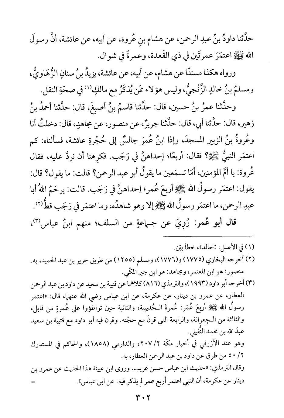 وحدَّثنا عمرُ بنُ حسين، قال: حدَّثنا قاسمُ بنُ أصبغَ، قال: حدَّثنا أحمدُ بنُ زهير، قال: حدَّثنا أبي، قال: حدَّثنا جريرٌ، عن منصور، عن مجاهدٍ، قال: دخلتُ أنا وعُروةُ بنُ الزبير المسجدَ، وإذا ابنُ عُمرَ جالسٌ إلى حُجْرةِ عائشة، فسألناه: كم اعتمَر النبيُّ - صلى الله عليه وسلم -؟ فقال: أربعًا؟ إحداهنَّ في رَجَب. فكرِهنا أن نردَّ عليه، فقال عُروة: يا أمَّ المؤمنين، أمَا تسمَعين ما يقولُ أبو عبد الرحمن؟ قالت: ما يقول؟ قال: يقول: اعتمَر رسولُ الله - صلى الله عليه وسلم - أربعَ عُمر، إحداهنَّ في رَجَب. قالت: يرحَمُ اللهُ أبا عبدِ الرحمن، ما اعتمَر رسولُ الله - صلى الله عليه وسلم - إلا وهو شاهدُه، وما اعتمَر في رَجَب قطُّ (¬٢).
