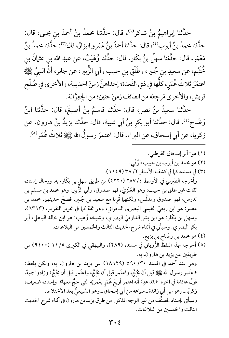 حدَّثنا سعيدُ بنُ نصر، قال: حدَّثنا قاسمُ بنُ أصبغَ، قال: حدَّثنا ابنُ وَضّاح (¬٤)، قال: حدَّثنا أبو بكرِ بنُ أبي شيبة، قال: حدَّثنا يزيدُ بنُ هارون، عن زكريا، عن أبي إسحاق، عن البراء، قال: اعتمرَ رسولُ الله - صلى الله عليه وسلم - ثلاثَ عُمَر (¬٥).