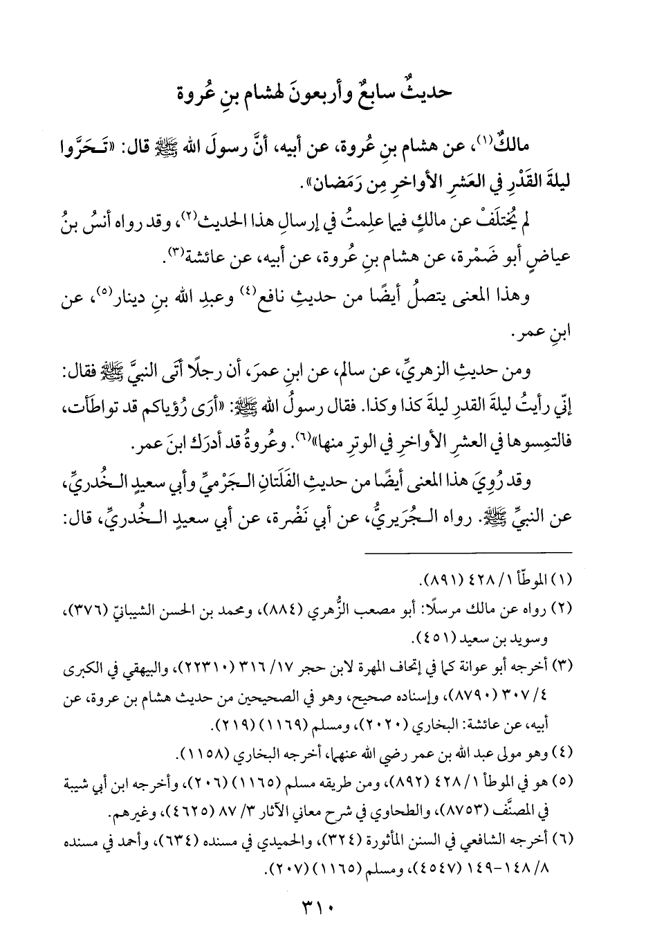 مالكٌ (¬١)، عن هشام بنِ عُروة، عن أبيه، أنَّ رسولَ الله - صلى الله عليه وسلم - قال: "تَحَرَّوا ليلةَ القَدْرِ في العَشرِ الأواخرِ مِن رَمَضان".