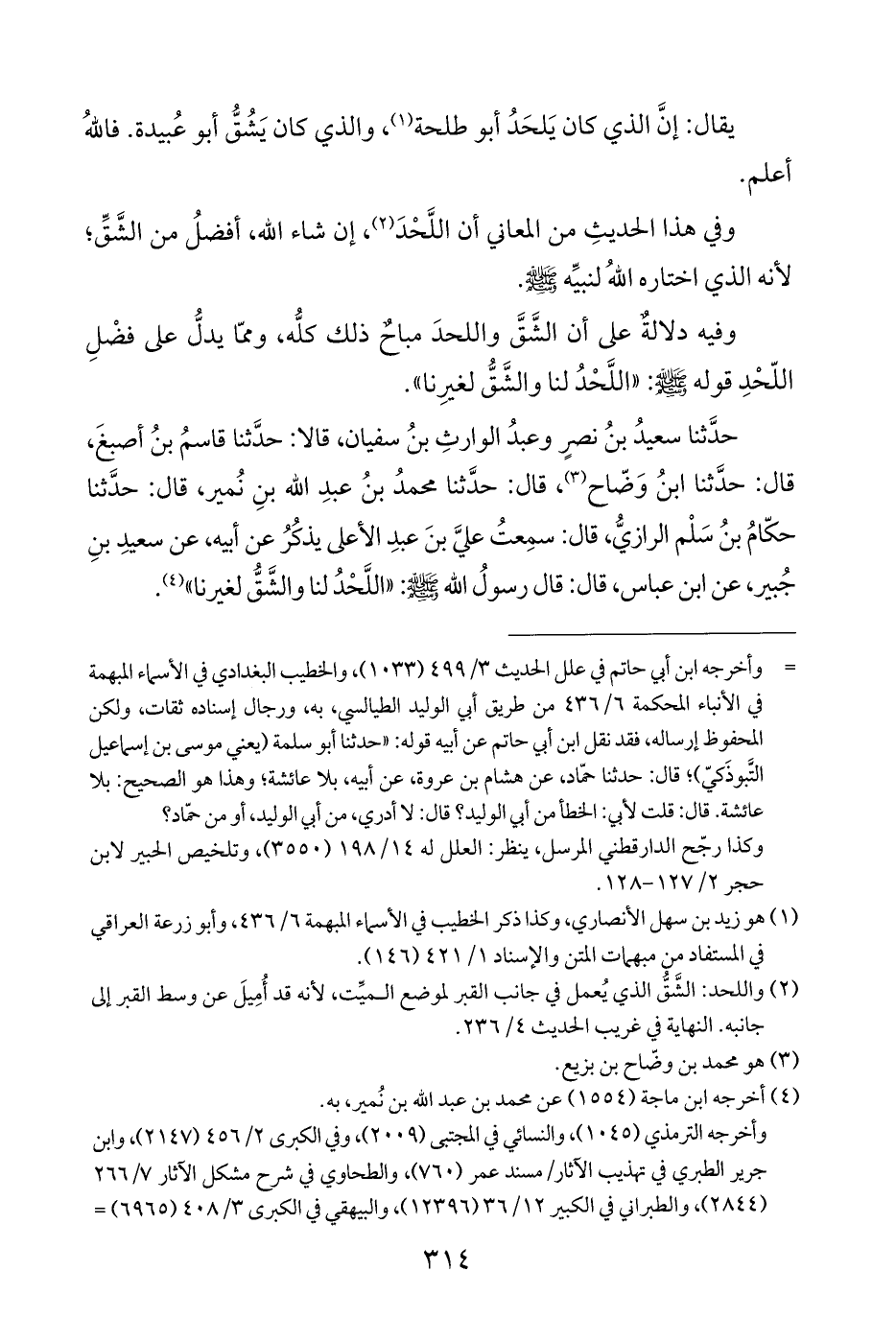 حدَّثنا سعيدُ بنُ نصرٍ وعبدُ الوارثِ بنُ سفيان، قالا: حدَّثنا قاسمُ بنُ أصبغَ، قال: حدَّثنا ابنُ وَضّاح (¬٣)، قال: حدَّثنا محمدُ بنُ عبدِ الله بنِ نُمير، قال: حدَّثنا حكّامُ بنُ سَلْم الرازيُّ، قال: سمِعتُ عليَّ بنَ عبدِ الأعلى يذكُرُ عن أبيه، عن سعيدِ بنِ جُبير، عن ابن عباس، قال: قال رسولُ الله - صلى الله عليه وسلم -: "اللَّحْدُ لنا والشَّقُّ لغيرنا" (¬٤).