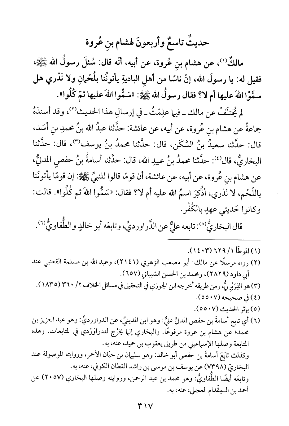 مالكٌ (¬١)، عن هشام بنِ عُروة، عن أبيه، أنّه قال: سُئلَ رسولُ الله - صلى الله عليه وسلم -، فقيل له: يا رسولَ الله، إنّ ناسًا من أهلِ الباديةِ يأتونُنا بلُحْمانِ ولا نَدْري هل سمَّوْا اللهَ عليها أم لا؟ فقال رسولُ الله - صلى الله عليه وسلم -: "سَمُّوا اللهَ عليها ثمّ كلُوا".