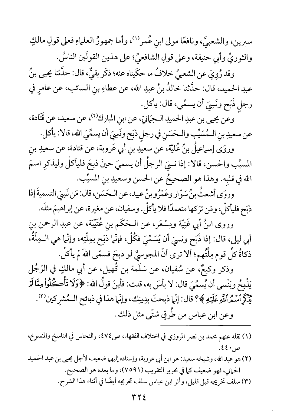 وقد رُوِيَ عن الشعبيِّ خلافُ ما حكَيناه عنه؛ ذكَر بقيٌّ، قال: حدَّثنا يحيى بنُ عبدِ الحميد، قال: حدَّثنا خالدُ بنُ عبدِ الله، عن عطاءِ بنِ السائب، عن عامرٍ في رجلٍ ذَبَح ونَسِيَ أن يسمِّي، قال: يأكل.