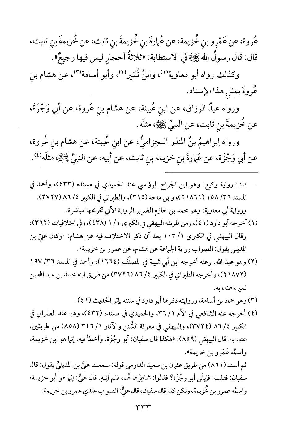 عُروة، عن عَمْرِو بنِ خُزيمة، عن عُمارةَ بنِ خُزيمةَ بنِ ثابت، عن خُزيمةَ بنِ ثابت، قال: قال رسولُ الله - صلى الله عليه وسلم - في الاستطابة: "ثلاثةُ أحجارٍ ليس فيها رجيعٌ".