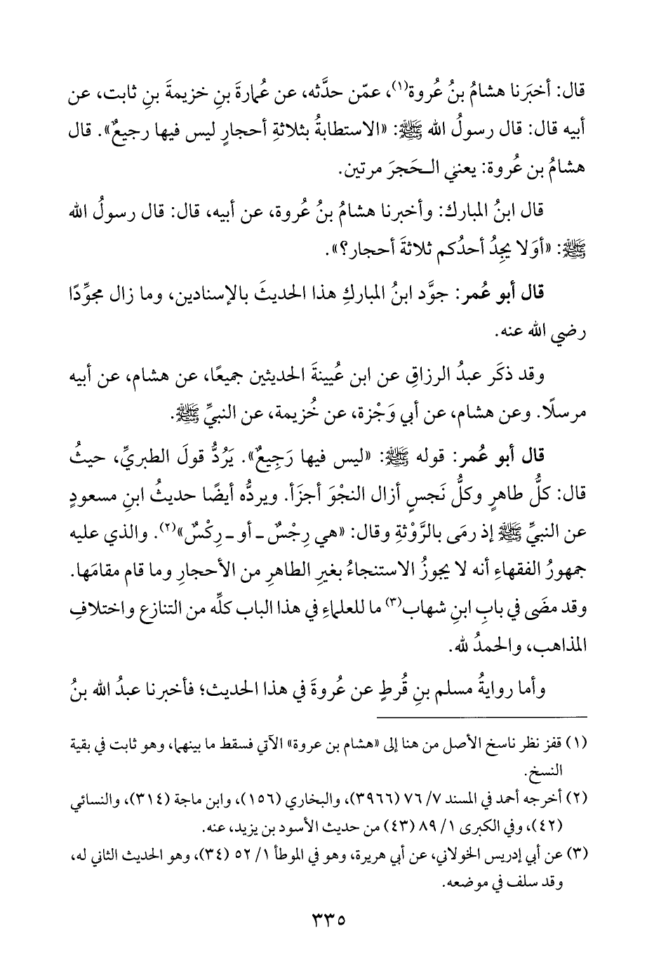 قال ابنُ المبارك: وأخبرنا هشامُ بنُ عُروة، عن أبيه، قال: قال رسولُ الله - صلى الله عليه وسلم -: "أوَلا يجِدُ أحدُكم ثلاثةَ أحجار؟ ".