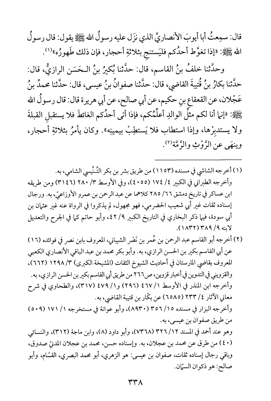 وحدَّثنا خلفُ بنُ القاسم، قال: حدَّثنا بُكيرُ بنُ الحَسَن الرازيُّ، قال: حدَّثنا بكارُ بنُ قُتيبةَ القاضي، قال: حدَّثنا صفوانُ بنُ عيسى، قال: حدَّثنا محمدُ بنُ عَجْلان، عن القعقاع بن حكيم، عن أبي صالح، عن أبي هريرة قال: قال رسولُ الله - صلى الله عليه وسلم -: "إنما أنا لكم مثل الوالدِ أعلِّمُكم، فإذا أتى أحدُكم الغائطَ فلا يستقبلِ القبلةَ ولا يستدبِرْها، وإذا استطاب فلا يَستطِبْ بيمينِه". وكان يأمرُ بثلاثةِ أحجار، وينهَى عن الرَّوْثِ والرَّمَّة (¬٢).