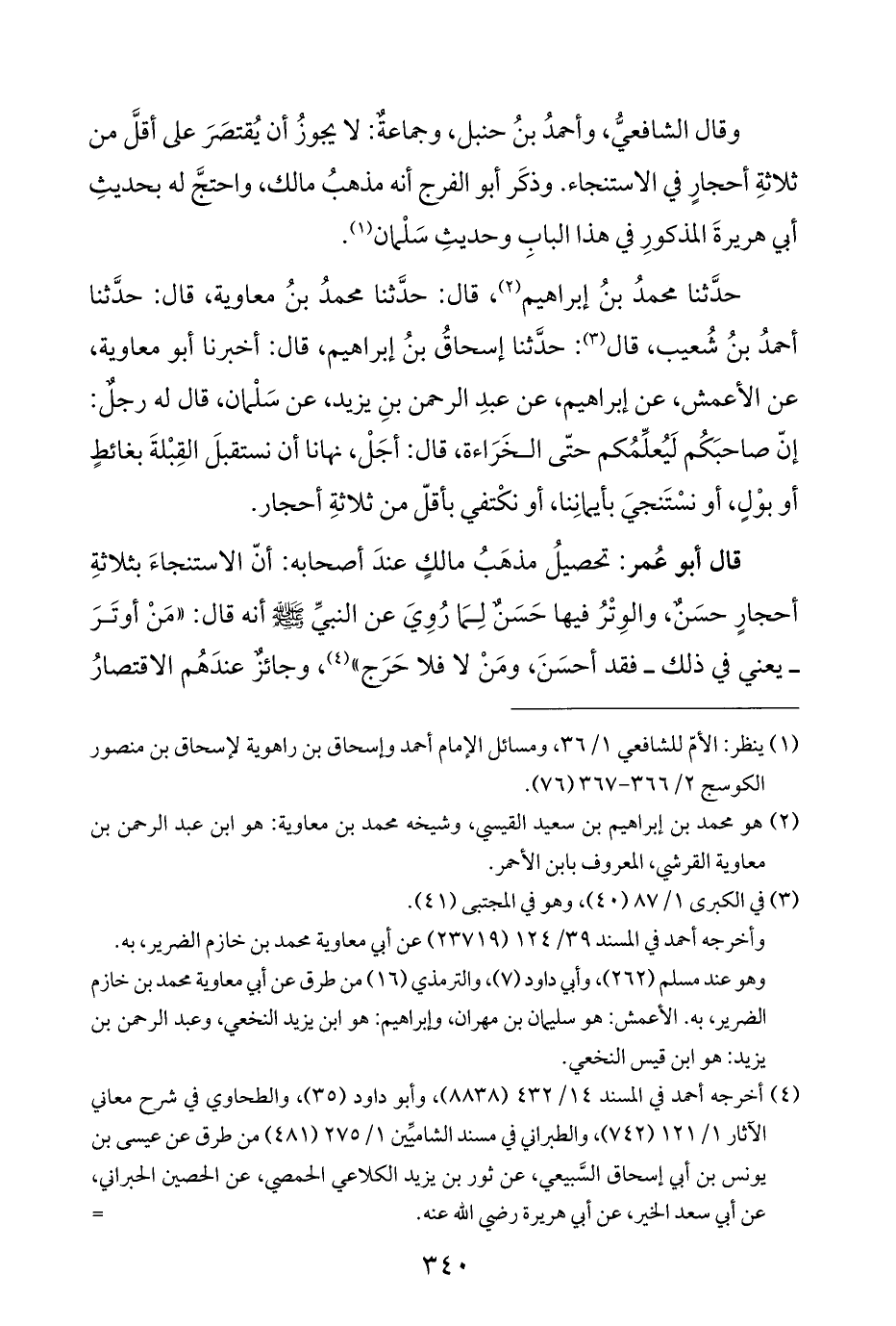 وقال الشافعيُّ، وأحمدُ بنُ حنبل، وجماعة: لا يحوزُ أن يُقتصرَ على أقلَّ من ثلاثةِ أحجارٍ في الاستنجاء. وذكَر أبو الفرج أنه مذهبُ مالك، واحتجَّ له بحديثِ أبي هريرةَ المذكورِ في هذا البابِ وحديثِ سَلْمان (¬١).