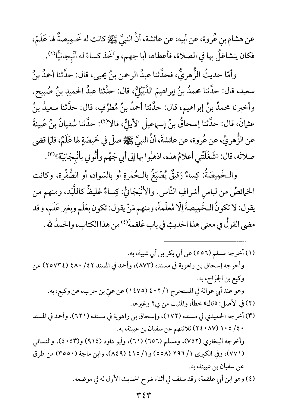 وأمّا حديثُ الزُّهريُّ، فحدَّثنا عبدُ الرحمن بنُ يحيى، قال: حدَّثنا أحمدُ بنُ سعيد، قال: حدَّثنا محمدُ بنُ إبراهيمَ الدَّيْبُليُّ، قال: حدَّثنا عبدُ الحميدِ بنُ صُبيح. وأخبرنا محمدُ بنُ إبراهيم، قال: حدَّثنا أحمدُ بنُ مُطرِّفٍ، قال: حدَّثنا سعيدُ بنُ عثمانَ، قال: حدَّثنا إسحاقُ بنُ إسماعيلَ الأيليُّ، قالا (¬٢): حدَّثنا سُفيانُ بنُ عُيينةَ عن الزُّهريِّ، عن عُروة، عن عائشةَ، أنَّ النبيَّ - صلى الله عليه وسلم - صلّى في خَميصَةٍ لها عَلَمٌ، فلمّا قضى صلاتَه، قال: "شَغَلَتْني أعلامُ هذه، اذهبُوا بها إلى أبي جَهْم وأْتُوني بأنْبِجَانِيّة" (¬٣).