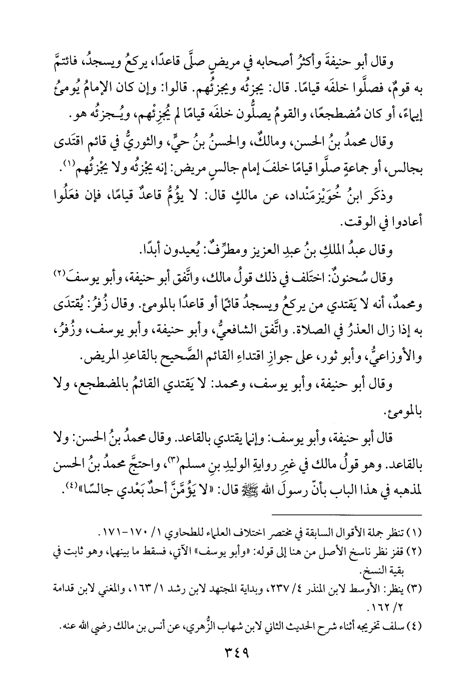 وقال سُحنونٌ: اختَلف في ذلك قولُ مالك، واتَّفق أبو حنيفة، وأبو يوسفَ (¬٢) ومحمدٌ، أنه لا يَقتدي من يركعُ ويسجدُ قائَمَا أو قاعدًا بالمومئ. وقال زُفرُ: يُقتدَى به إذا زال العذرُ في الصلاة. واتَّفق الشافعيُّ، وأبو حنيفة، وأبو يوسف، وزُفرُ، والأوزاعيُّ، وأبو ثور، على جوازِ اقتداءِ القائم الصَّحيح بالقاعدِ المريض.