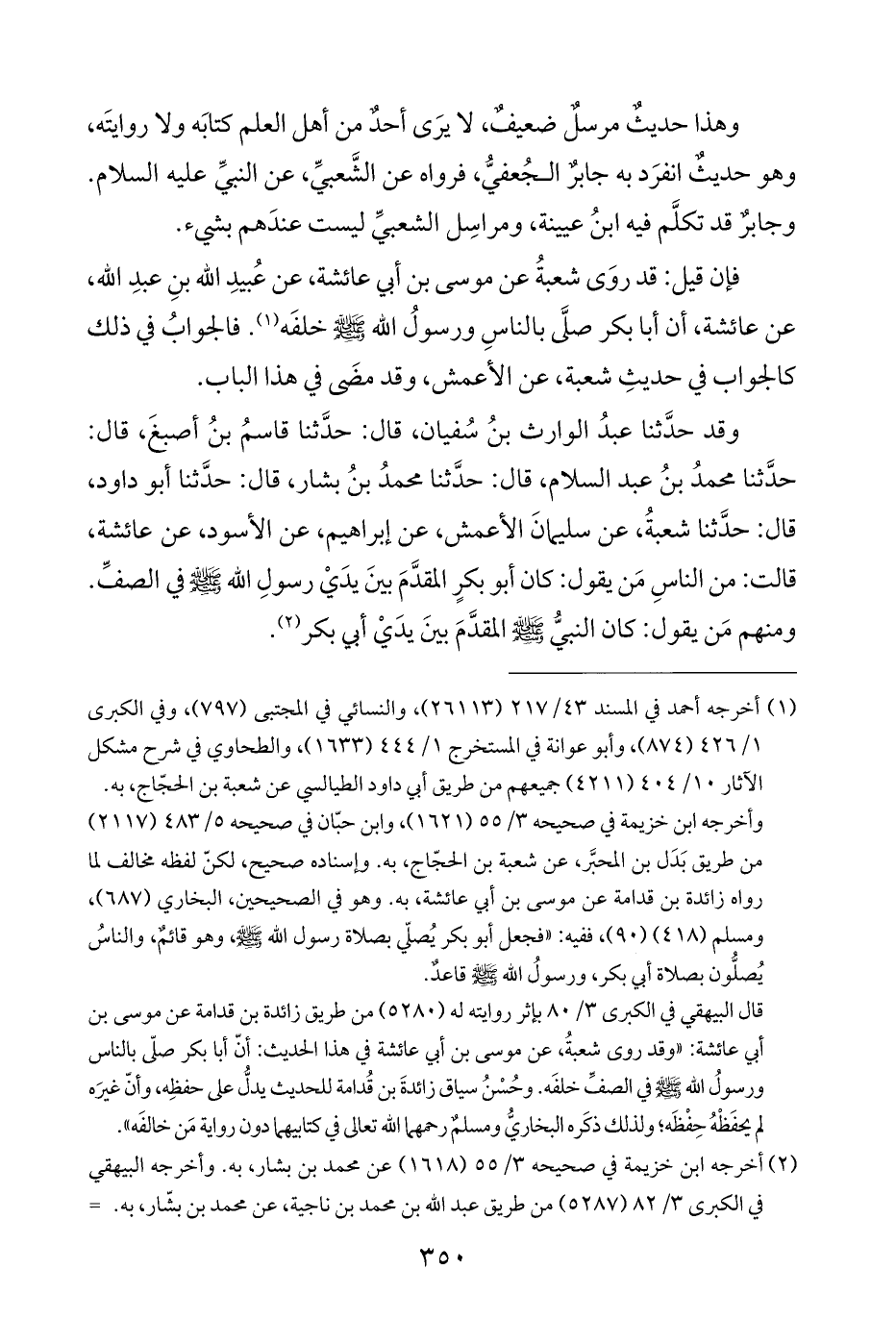 وقد حدَّثنا عبدُ الوارث بنُ سُفيان، قال: حدَّثنا قاسمُ بنُ أصبغَ، قال: حدَّثنا محمدُ بنُ عبد السلام، قال: حدَّثنا محمدُ بنُ بشار، قال: حدَّثنا أبو داود، قال: حدَّثنا شعبةُ، عن سليمانَ الأعمش، عن إبراهيم، عن الأسود، عن عائشة، قالت: من الناسِ مَن يقول: كان أبو بكرٍ المقدَّمَ بينَ يدَيْ رسولِ الله - صلى الله عليه وسلم - في الصفِّ. ومنهم مَن يقول: كان النبيُّ - صلى الله عليه وسلم - المقدَّمَ بينَ يدَيْ أبي بكر (¬٢).