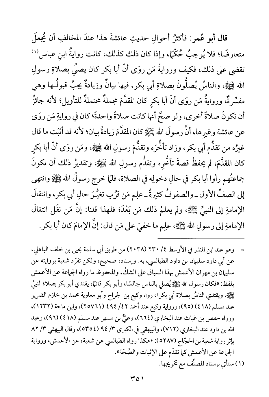 قال أبو عُمر: فأكثرُ أحوالِ حديثِ عائشةَ هذا عندَ المخالفِ أن يُجعلَ متعارضًا؛ فلا يُوجبُ حُكْمًا، وإذا كان ذلك كذلك، كانت روايةُ ابنِ عباس (¬١) تقضي على ذلك، فكيف وروايةُ مَن روَى أنّ أبا بكر كان يصلِّي بصلاةِ رسولِ الله - صلى الله عليه وسلم -، والناسُ يُصلُّونَ بصلاةِ أبي بكر، فيها بيانٌ وزيادةٌ يجبُ قبولُها وهي مفسِّرةٌ، وروايةُ مَن روَى أنّ أبا بكرٍ كان المقدَّمَ مجملةٌ محتملةٌ للتأويل؛ لأنه جائزٌ أن تكونَ صلاةً أخرى، ولو صحَّ أنها كانت صلاةً واحدةً؟ كان في روايةِ مَن روَى عن عائشة وغيرِها، أنَّ رسولَ الله - صلى الله عليه وسلم - كان المقدَّمَ زيادةُ بيان؛ لأنه قد أثبَت ما قال غيرُه من تقدُّم أبي بكر، وزاد تأخُّرَه وتقدُّمَ رسولِ الله - صلى الله عليه وسلم -، ومَن روَى أنّ أبا بكرٍ كان المقدَّمَ، لم يحفظْ قصةَ تأخُّرِه وتقدُّم رسولِ الله - صلى الله عليه وسلم -، وتقديرُ ذلك أن تكونَ جماعتُهم رأوا أبا بكر في حالِ دخولِه في الصلاة، فلمّا خرج رسولُ الله - صلى الله عليه وسلم - وانتهى إلى الصفِّ الأول - والصفوفُ كثيرةٌ - علِم مَن قرُب تغيُّرَ حالِ أبي بكر، وانتقالَ الإمامةِ إلى النبيِّ - صلى الله عليه وسلم -، ولم يعلمْ ذلك مَن بَعُدَ؛ فلهذا قلنا: إنَّ مَن نقَل انتقالَ الإمامةِ إلى رسولِ الله - صلى الله عليه وسلم -، علِم ما خفيَ على مَن قال: إنَّ الإمامَ كان أبا بكر.