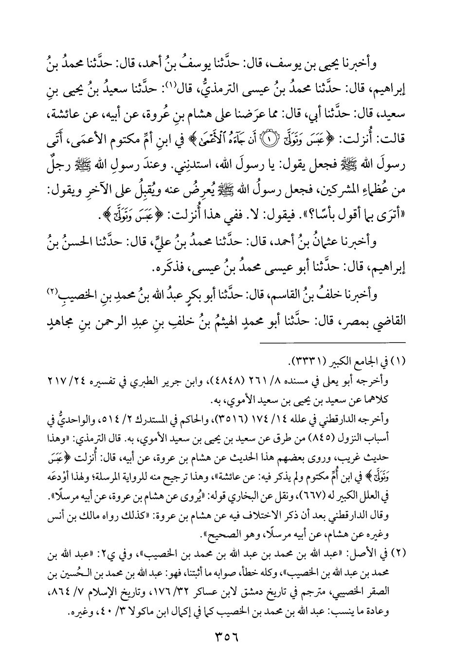 وأخبرنا يحيى بن يوسف، قال: حدَّثنا يوسفُ بنُ أحمد، قال: حدَّثنا محمدُ بنُ إبراهيم، قال: حدَّثنا محمدُ بنُ عيسى الترمذيُّ، قال (¬١): حدَّثنا سعيدُ بنُ يحيى بنِ سعيد، قال: حدَّثنا أبي، قال: مما عرَضنا على هشام بنِ عُروة، عن أبيه، عن عائشة، قالت: أُنزلت: {عَبَسَ وَتَوَلَّى (١) أَنْ جَاءَهُ الْأَعْمَى} في ابنِ أمِّ مكتوم الأعمَى، أتَى رسولَ الله - صلى الله عليه وسلم - فجعل يقول: يا رسولَ الله، استدنِني. وعندَ رسولِ الله - صلى الله عليه وسلم - رجلٌ من عُظماءِ المشركين، فجعل رسولُ الله - صلى الله عليه وسلم - يُعرِضُ عنه ويُقبِلُ على الآخرِ ويقول: "أترَى بما أقول بأسًا؟ ". فيقول: لا. ففي هذا أُنزلت: {عَبَسَ وَتَوَلَّى}.
