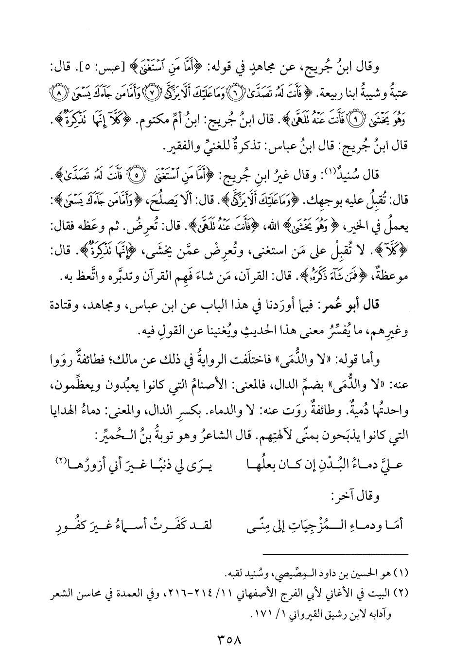 قال سُنيدٌ (¬١): وقال غيرُ ابنِ جُريج: {أَمَّا مَنِ اسْتَغْنَى (٥) فَأَنْتَ لَهُ تَصَدَّى}. قال: تُقبِلُ عليه بوجهِك. {وَمَا عَلَيْكَ أَلَّا يَزَّكَّى}. قال: ألّا يَصلُحَ، {وَأَمَّا مَنْ جَاءَكَ يَسْعَى}: يعملُ في الخير، {وَهُوَ يَخْشَى} الله، {فَأَنْتَ عَنْهُ تَلَهَّى}. قال: تُعرِضُ. ثم وعَظه فقال: {كَلَّا}. لا تُقبِلْ على مَن استغنى، وتُعرِضْ عمَّن يخشَى، {إِنَّهَا تَذْكِرَةٌ}. قال: موعظةٌ، {فَمَنْ شَاءَ ذَكَرَهُ}. قال: القرآن، مَن شاءَ فَهِم القرآن وتدبَّره واتَّعظ به.
