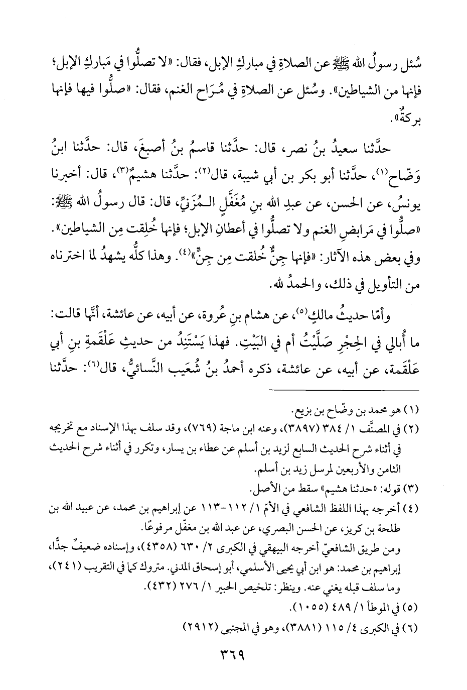 حدَّثنا سعيدُ بنُ نصر، قال: حدَّثنا قاسمُ بنُ أصبغَ، قال: حدَّثنا ابنُ وَضّاح (¬١)، حدَّثنا أبو بكر بن أبي شيبة، قال (¬٢): حدَّثنا هشيمٌ (¬٣)، قال: أخبرنا يونسُ، عن الحسن، عن عبدِ الله بنِ مُغَفَّلٍ المُزَنيِّ، قال: قال رسولُ الله - صلى الله عليه وسلم -: "صلُّوا في مَرابضِ الغنم ولا تصلُّوا في أعطانِ الإبل؛ فإنها خُلِقت مِن الشياطين". وفي بعض هذه الآثار: "فإنها جِنّ خُلقت مِن جِنٍّ" (¬٤). وهذا كلُّه يشهدُ لما اخترناه من التأويل في ذلك، والحمدُ لله.