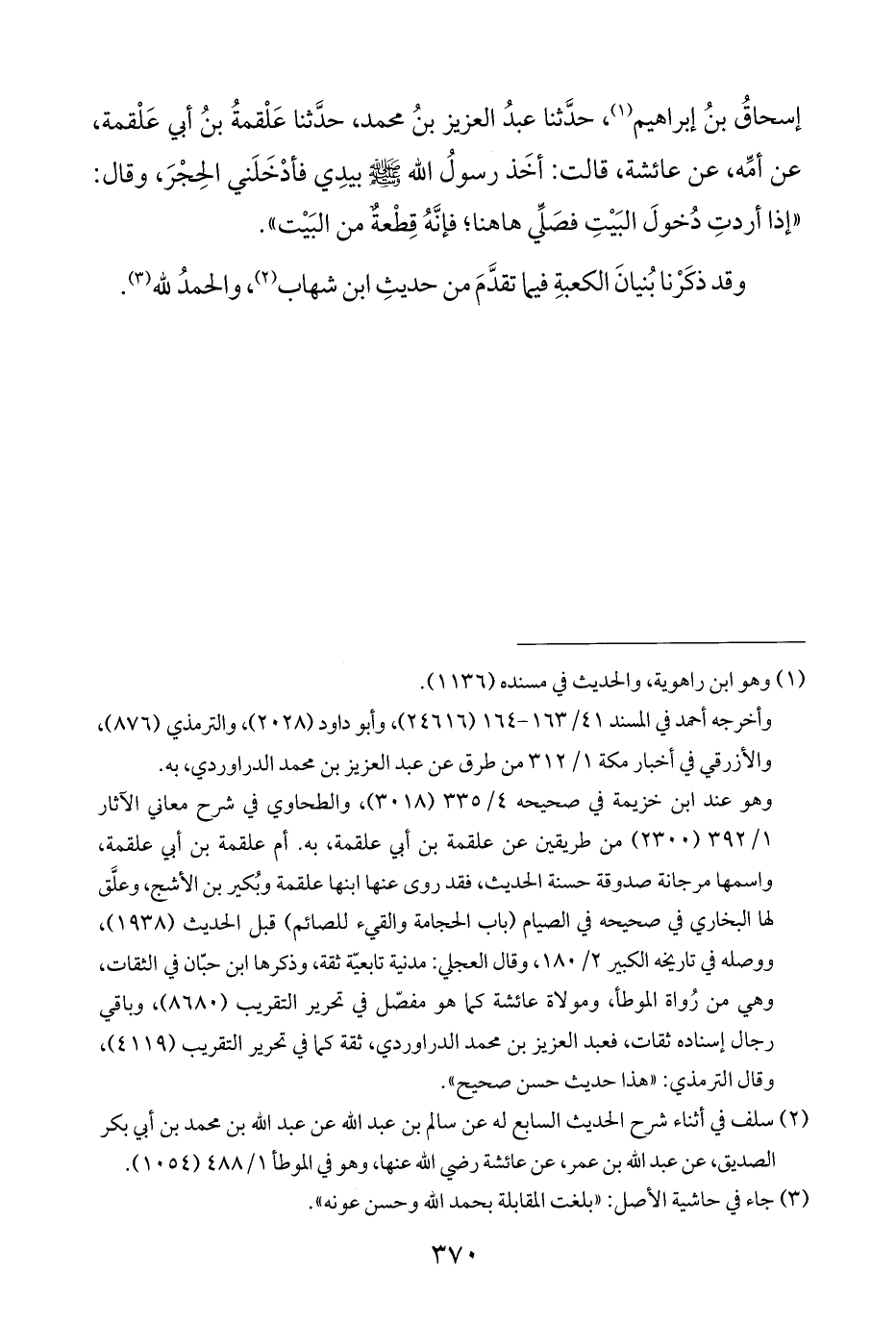 إسحاقُ بنُ إبراهيم (¬١)، حدَّثنا عبدُ العزيز بنُ محمد، حدثنا عَلْقمةُ بنُ أبي عَلْقمة، عن أمِّه، عن عائشة، قالت: أخَذ رسولُ الله - صلى الله عليه وسلم - بيدِي فأدْخَلَني الحِجْرَ، وقال: "إذا أردتِ دُخولَ البَيْتِ فصَلِّي هاهنا؟ فإنَّهُ قِطْعةٌ من البَيْت".