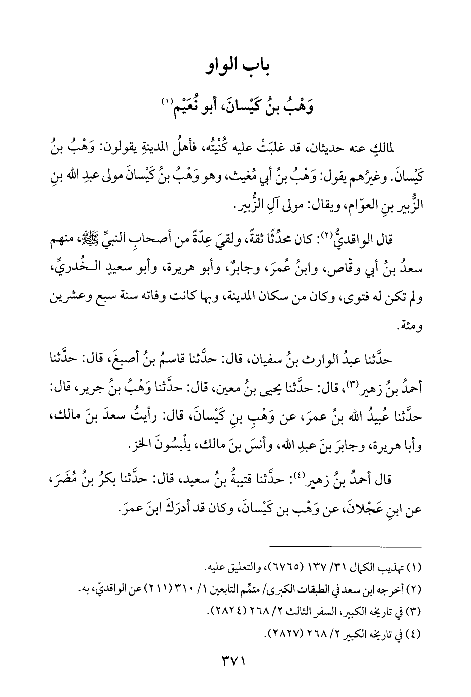 قال أحمدُ بنُ زهير (¬٤): حدَّثنا قتيبةُ بنُ سعيد، قال: حدَّثنا بكرُ بنُ مُضَرَ، عن ابنِ عَجْلانَ، عن وَهْب بن كَيْسانَ، وكان قد أدرَكَ ابنَ عمرَ.