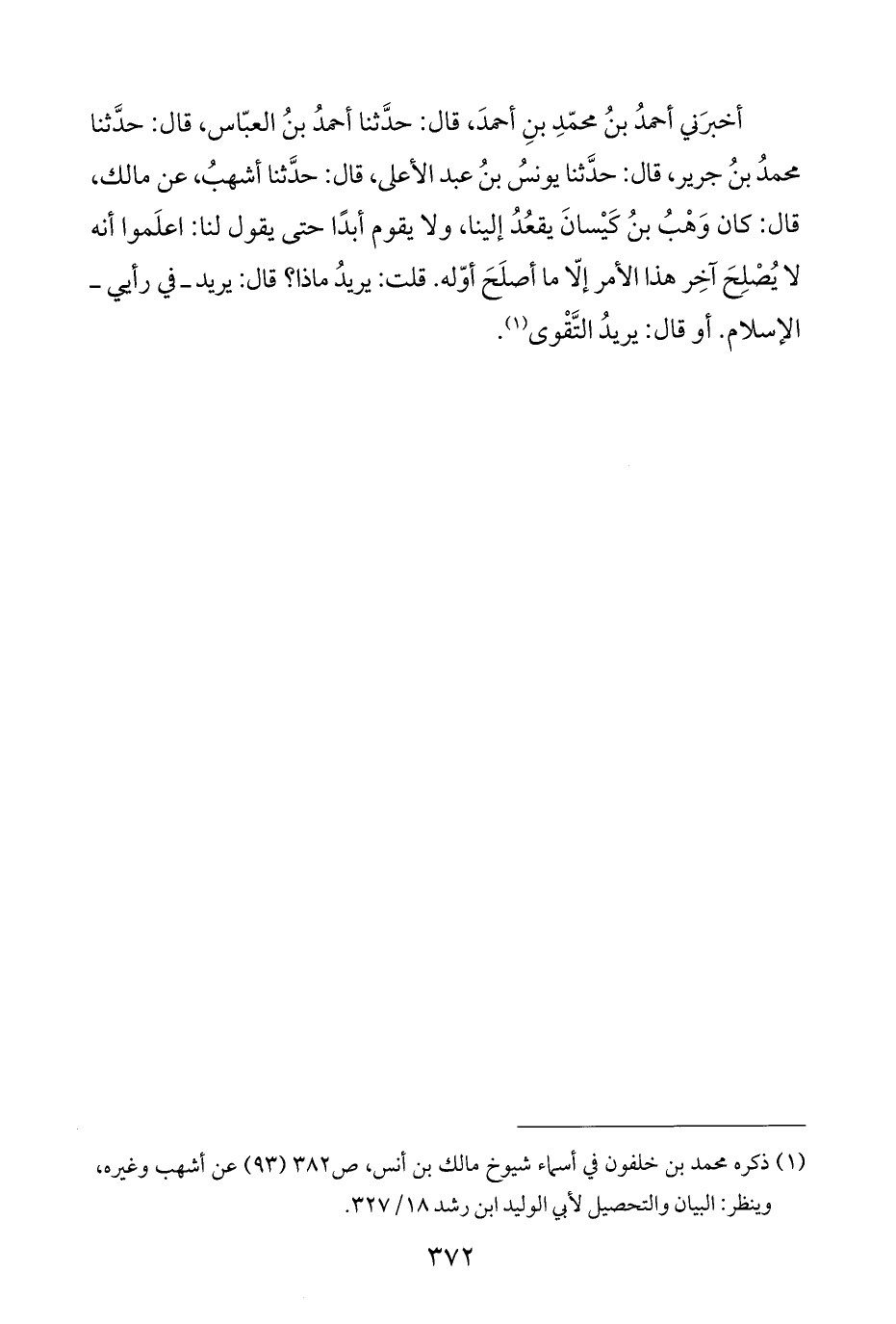 أخبرَني أحمدُ بنُ محمّدِ بنِ أحمدَ، قال: حدَّثنا أحمدُ بنُ العبّاس، قال: حدَّثنا محمدُ بنُ جرير، قال: حدَّثنا يونسُ بنُ عبد الأعلى، قال: حدَّثنا أشهبُ، عن مالك، قال: كان وَهْبُ بنُ كَيْسانَ يقعُدُ إلينا، ولا يقوم أبدًا حتى يقول لنا: اعلَموا أنه لا يُصْلِحَ آخِر هذا الأمر إلّا ما أصلَحَ أوّله. قلت: يريدُ ماذا؟ قال: يريد - في رأيي - الإسلام. أو قال: يريدُ التَّقْوى (¬١).