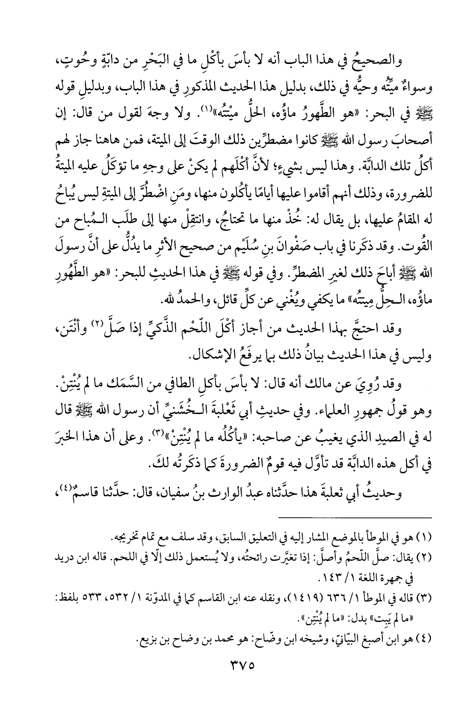 وقد رُوِيَ عن مالك أنه قال: لا بأسَ بأكلِ الطافي من السَّمَك ما لم يُنْتِنْ. وهو قولُ جمهورِ العلماء. وفي حديثِ أبي ثَعْلبةَ الخُشَنيِّ أن رسول الله - صلى الله عليه وسلم - قال له في الصيدِ الذي يغيبُ عن صاحبه: "يأكُلُه ما لم يُنْتِنْ" (¬٣). وعلى أن هذا الخبرَ في أكل هذه الدابَّة قد تأوَّل فيه قومٌ الضرورةَ كما ذكَرتُه لكَ.