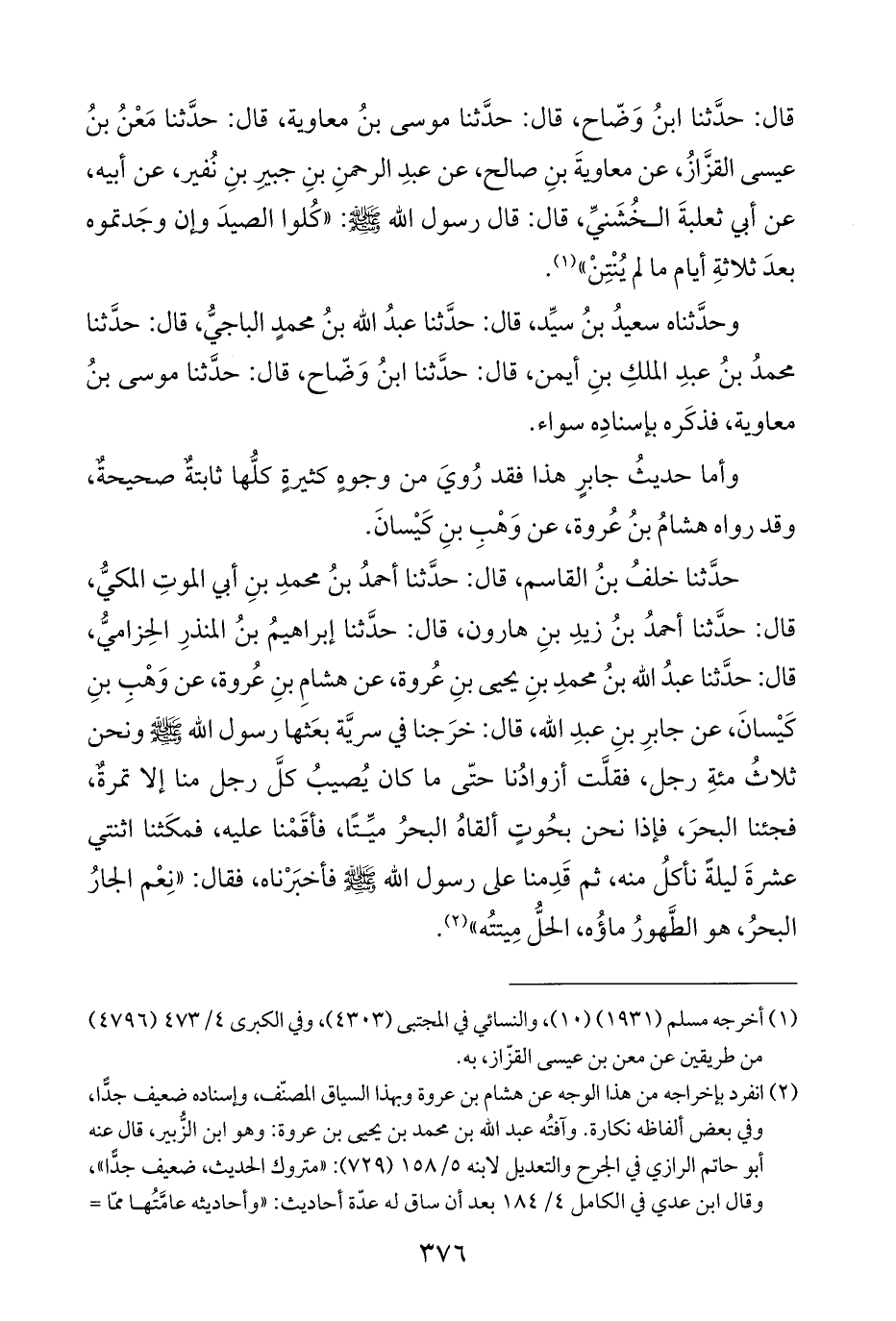 حدَّثنا خلفُ بنُ القاسم، قال: حدَّثنا أحمدُ بنُ محمدِ بنِ أبي الموتِ المكيُّ، قال: حدَّثنا أحمدُ بنُ زيدِ بنِ هارون، قال: حدَّثنا إبراهيمُ بنُ المنذرِ الحِزاميُّ، قال: حدَّثنا عبدُ الله بنُ محمدِ بنِ يحيى بنِ عُروة، عن هشامِ بنِ عُروة، عن وَهْبِ بنِ كَيْسانَ، عن جابرِ بنِ عبدِ الله، قال: خرَجنا في سريَّة بعَثها رسول الله - صلى الله عليه وسلم - ونحن ثلاثُ مئةِ رجل، فقلَّت أزوادُنا حتَّى ما كان يُصيبُ كلَّ رجل منا إلا تمرةٌ، فجئنا البحرَ، فإذا نحن بحُوتٍ ألقاهُ البحرُ ميِّتًا، فأقَمْنا عليه، فمكَثنا اثنتي عشرةَ ليلةً نأكلُ منه، ثم قَدِمنا على رسول الله - صلى الله عليه وسلم - فأخبَرْناه، فقال: "نِعْم الجارُ البحرُ، هو الطَّهورُ ماؤُه، الحلُّ مِيتتُه" (¬٢).